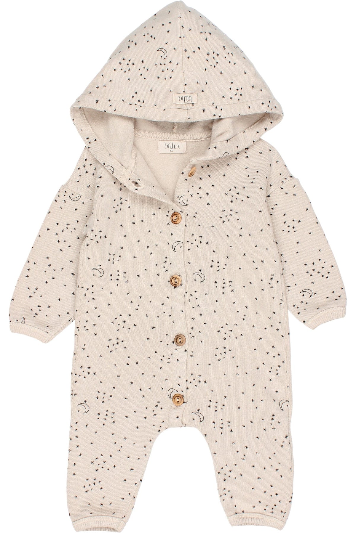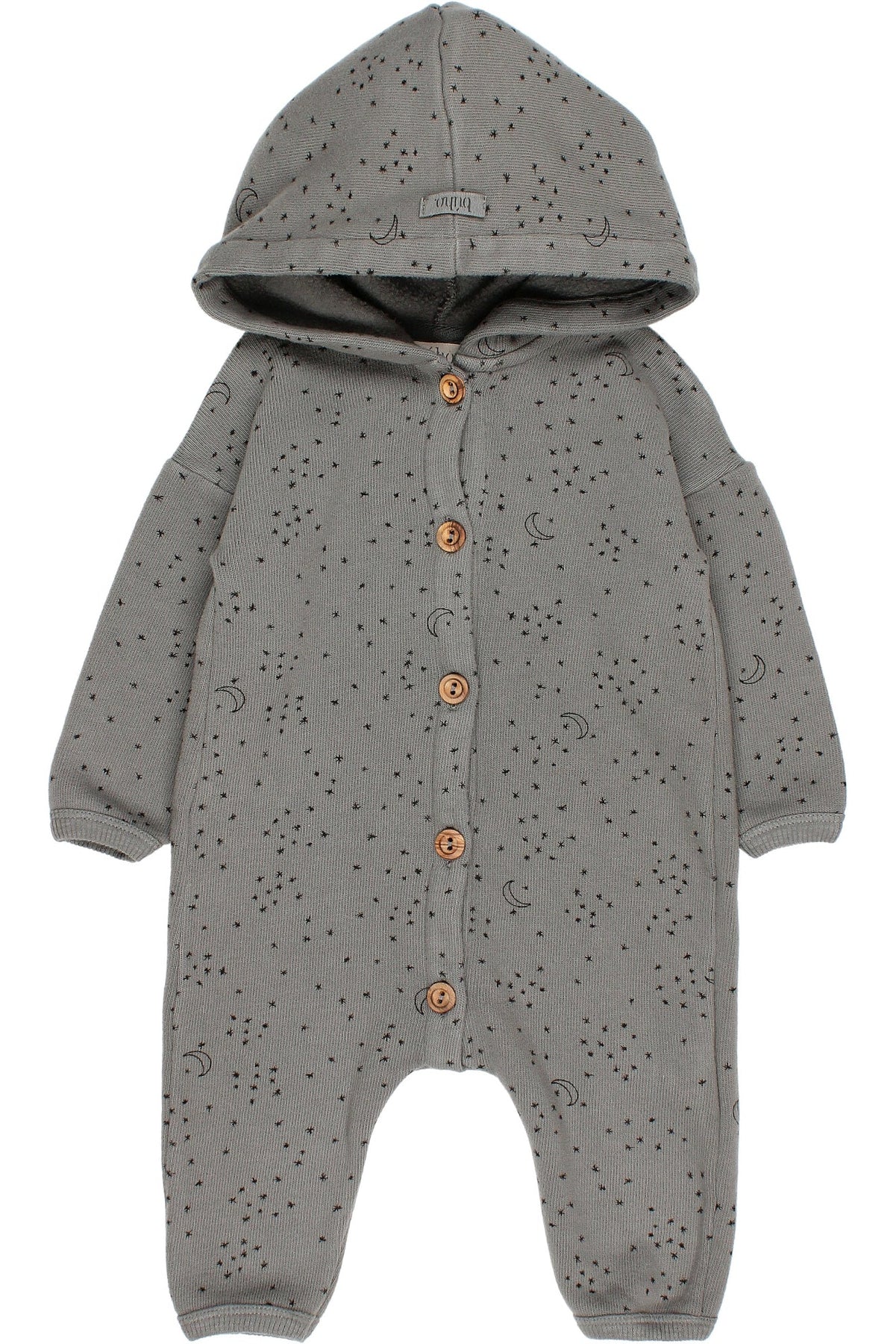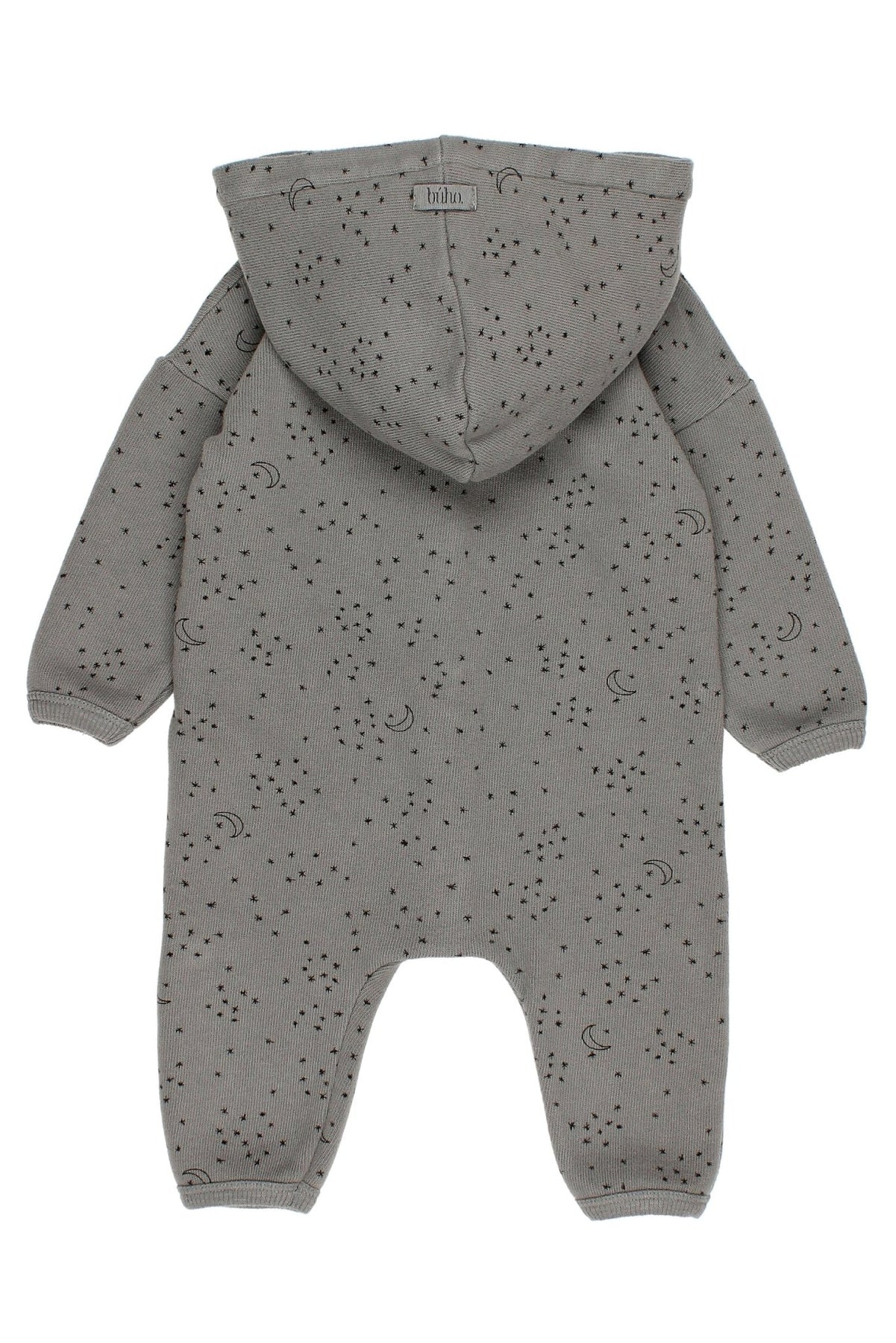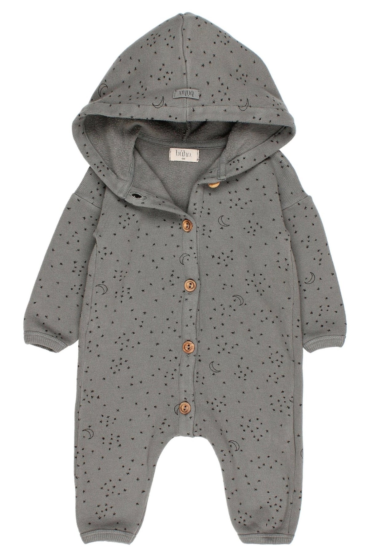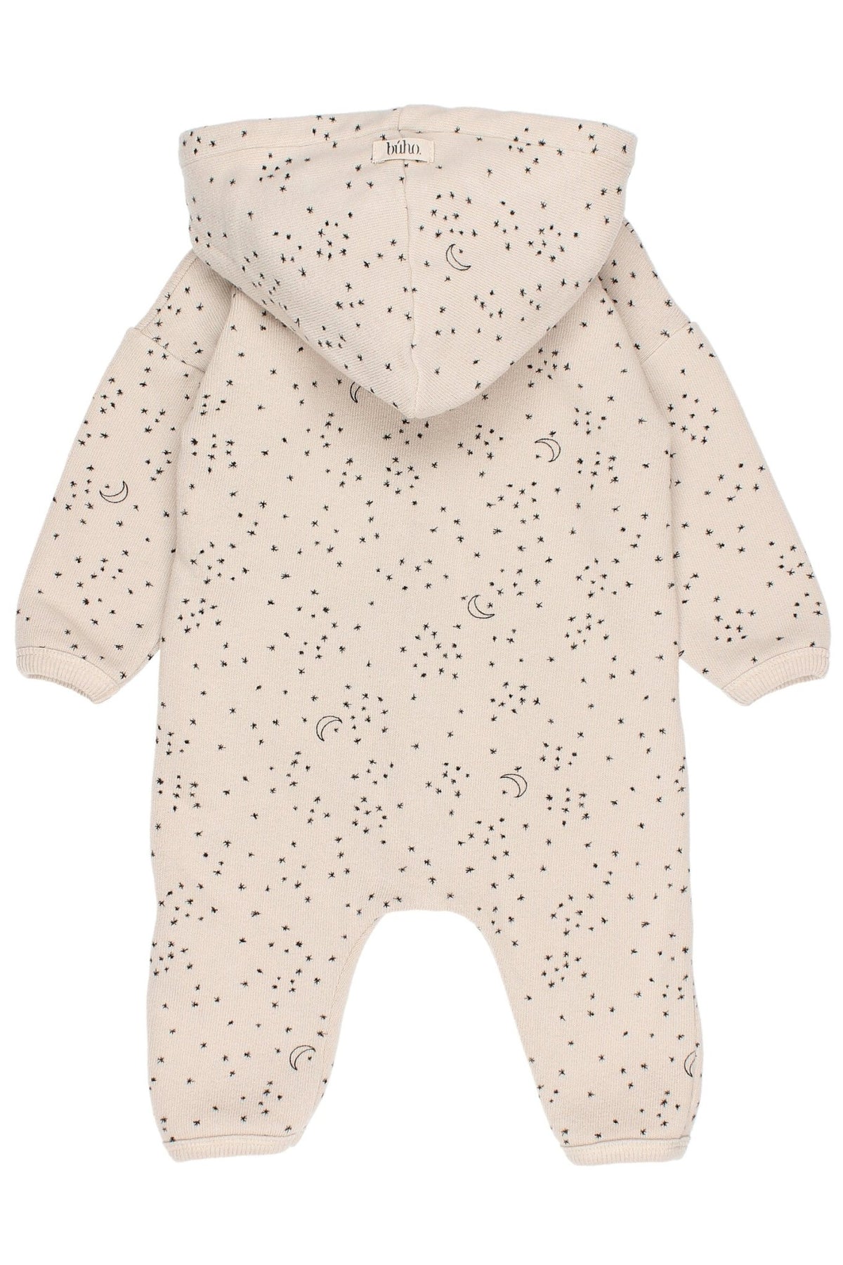Unisex baby soft fine knit celestial print hooded romper from Spanish brand Búho.