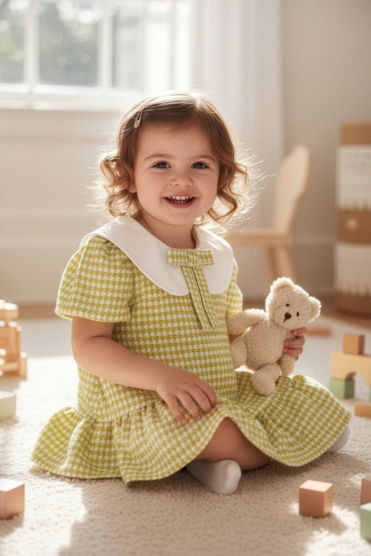 This girl’s dress from Portuguese brand Phi Clothing is a perfect blend of classic charm and playful elegance. Knitted in a soft green, yellow, and ivory houndstooth pattern, it features a drop waist silhouette for easy all-day wear. The extra-large white puritan-style collar adds a touch of vintage sweetness, while the oversized matching houndstooth bow at the neckline ties the whole look together.