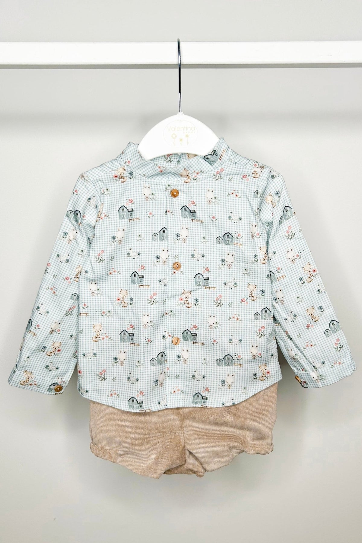 Baby boy's outfit set from Spanish brand Valentina Bebés. Super soft, mid-weight jersey cotton teal sweatshirt hoodie with super cute bunny and deer motif to chest, over lightweight woven-cotton teal gingham farmyard print long-sleeve shirt, paired with super soft beige needlecord shorts.