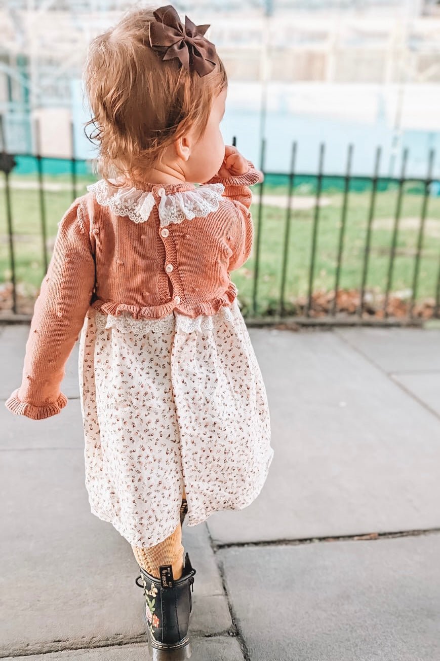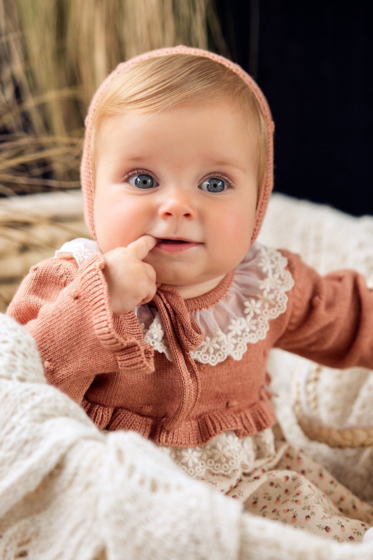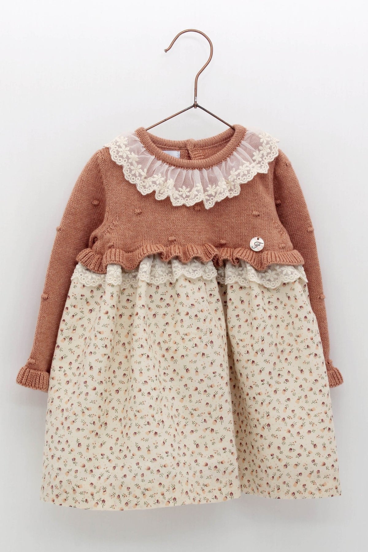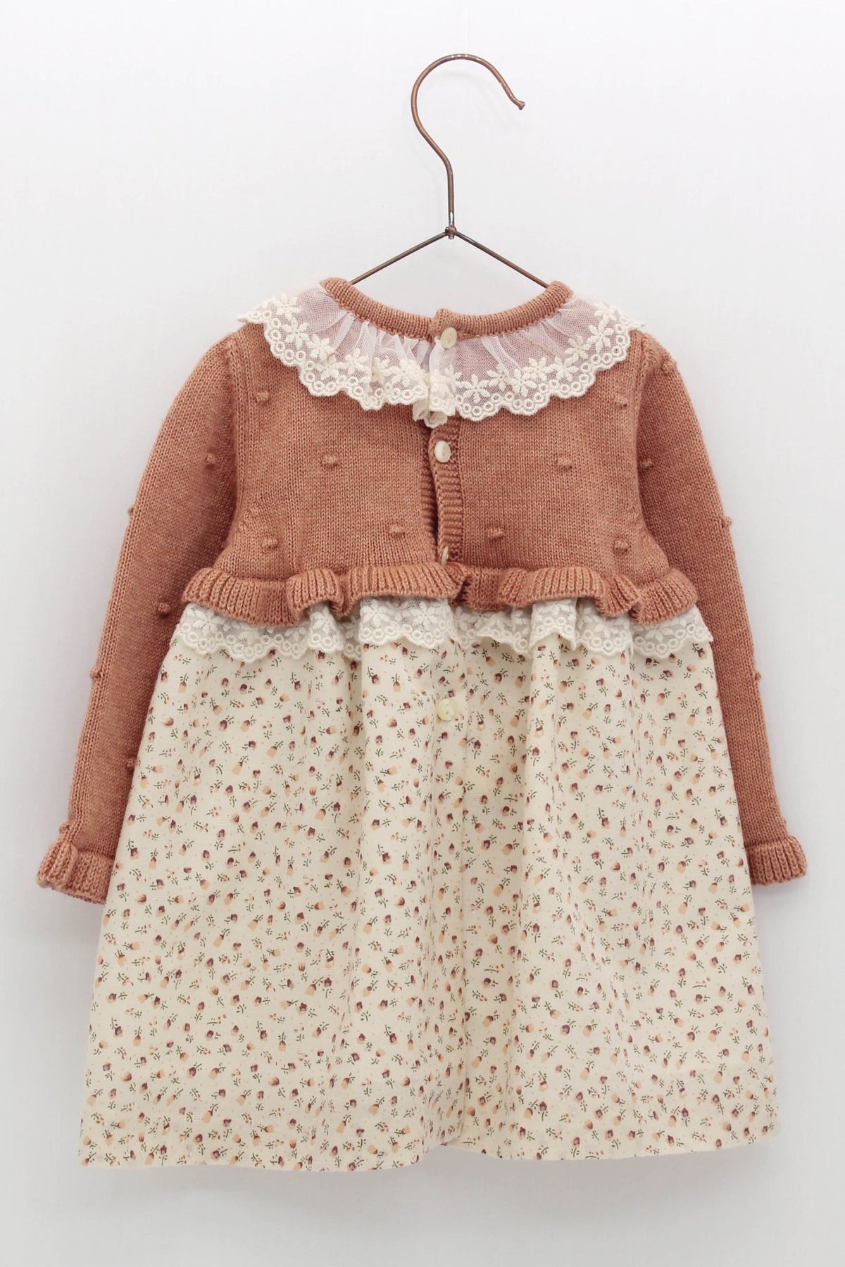 Baby girl's dress from Spanish brand Foque. Terracotta popcorn knit wool-blend long sleeve dress with divine ivory vintage lace ruffle collar and floral patterned skirt.