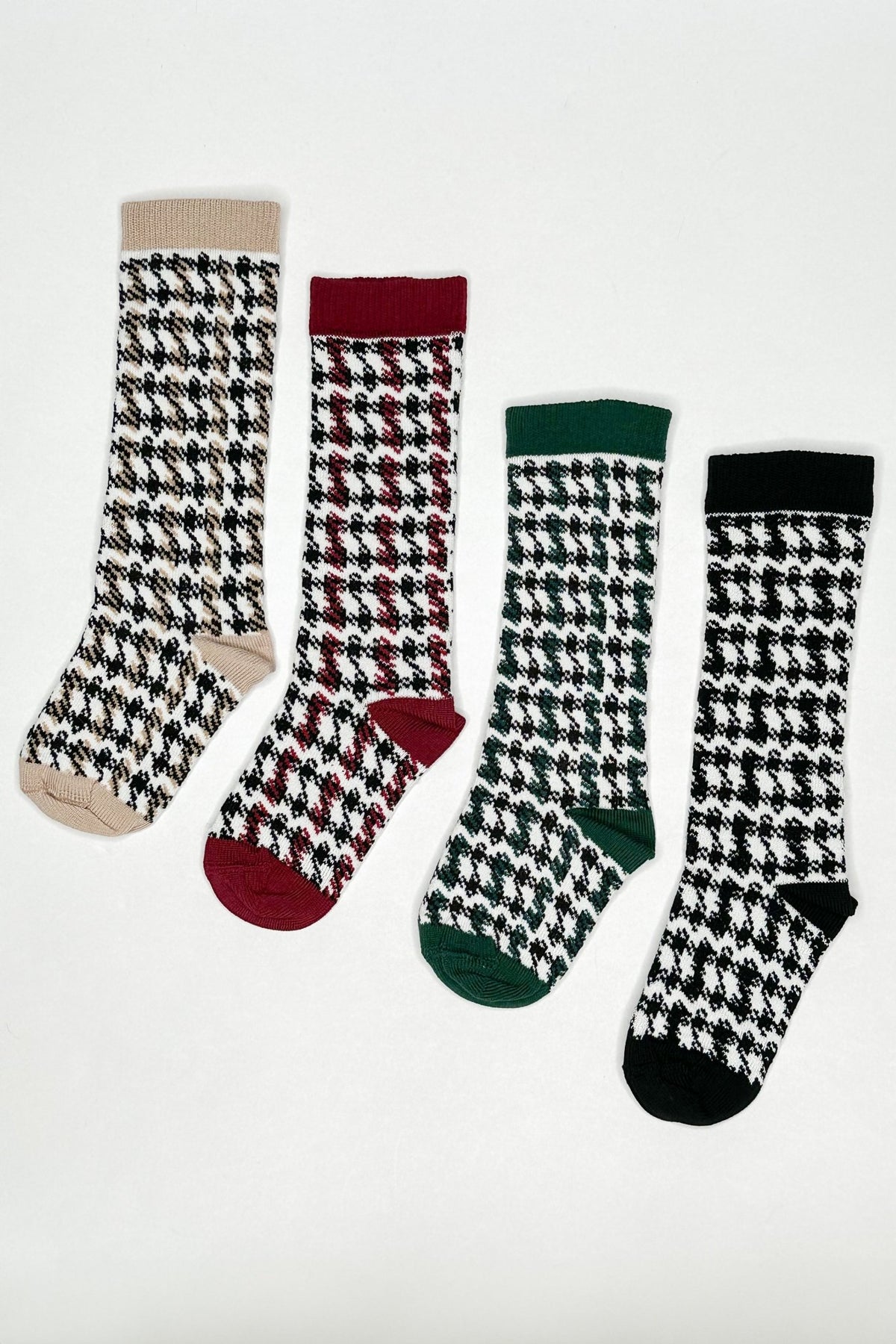 Unisex knee high houndstooth patterned socks from Portuguese brand Meia Pata. Features an anti-pressure cuff for little one's comfort. Choose from Beige, Burgundy, Bottle Green or Black.