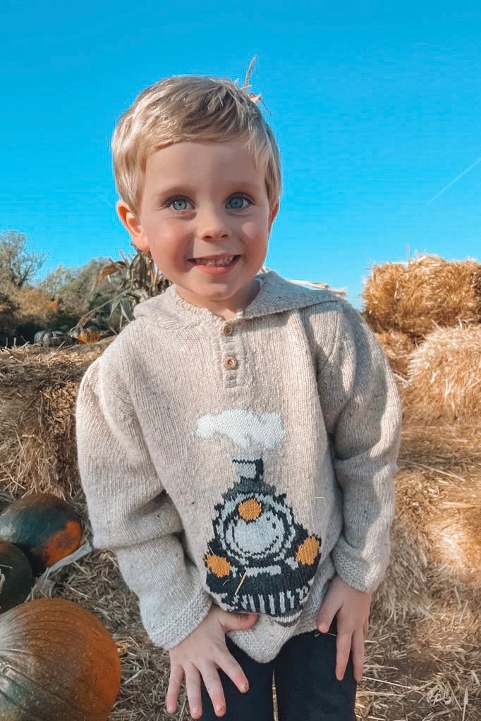 Boy's beige wool-blend knit hoodie with cute train motif from Spanish brand Foque.