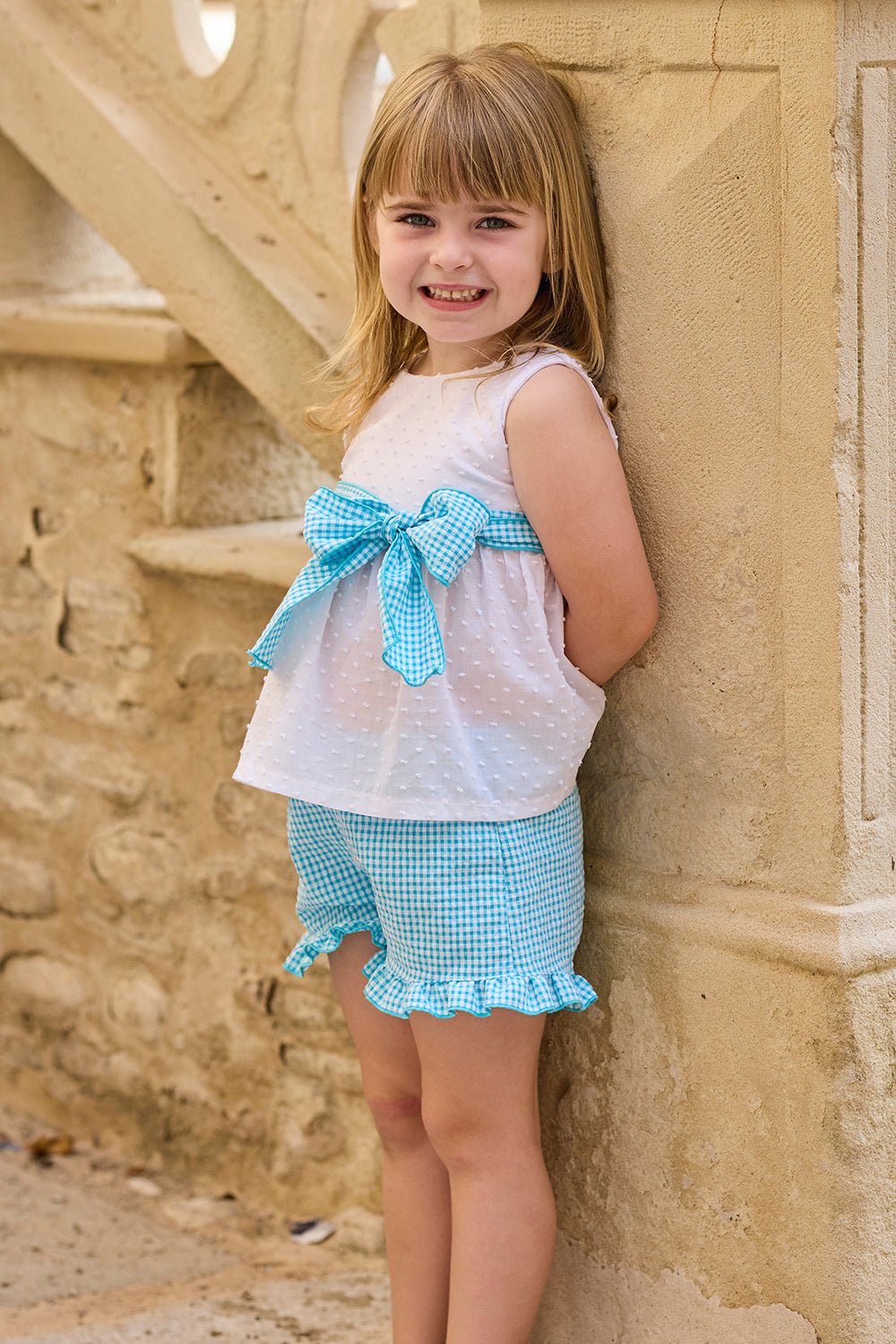 Light, fresh, and perfect for warm summer days, this two-piece set from Rapife is a beautifully easy outfit with a soft, feminine feel. The delicate white plumeti blouse adds a touch of texture, creating a floaty silhouette that feels both timeless and comfortable. The gently structured shape is finished with a V-shaped back and a statement turquoise gingham belt and bow, adding a pop of colour and tying the look together effortlessly. Paired with lightweight seersucker shorts, complete with an elasticated waist and soft frill detailing, this set is designed for comfort, movement, and all-day wear.