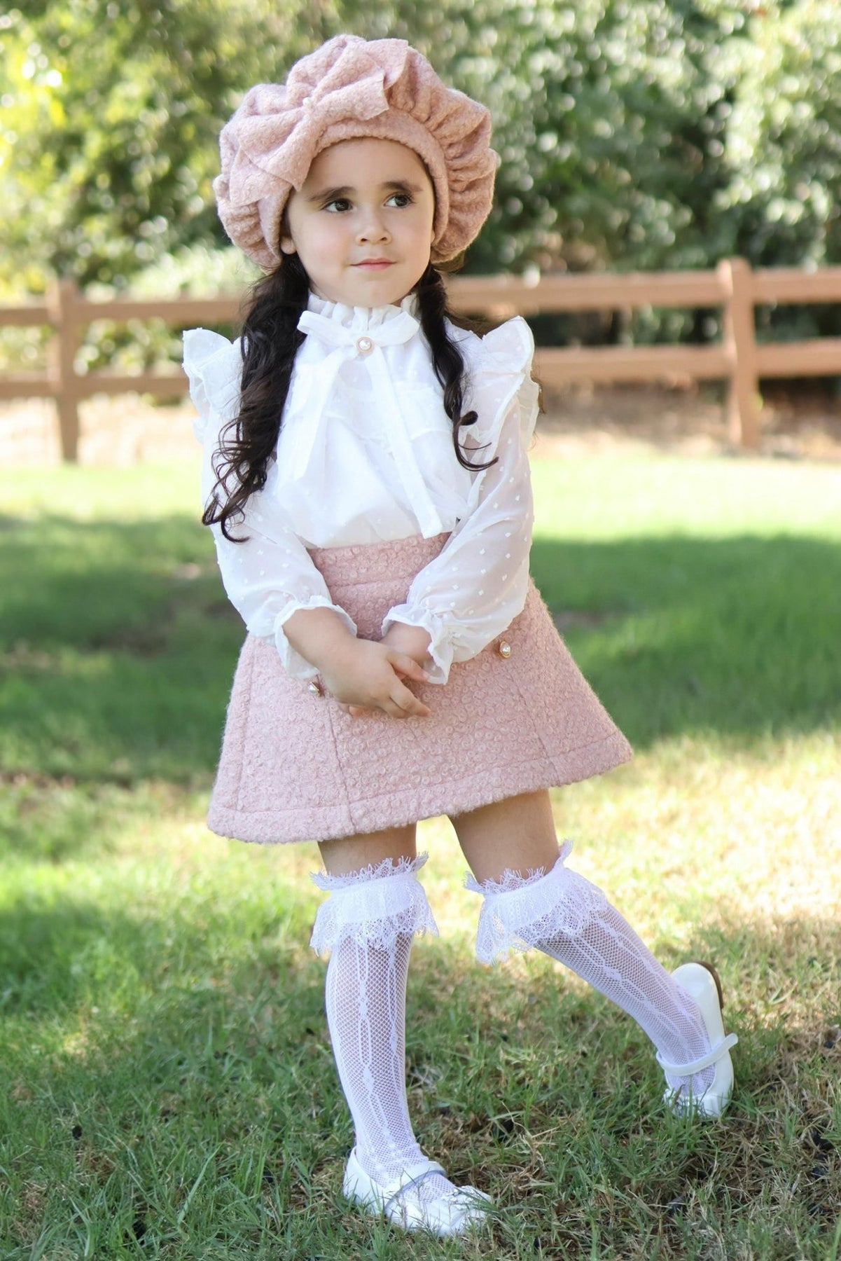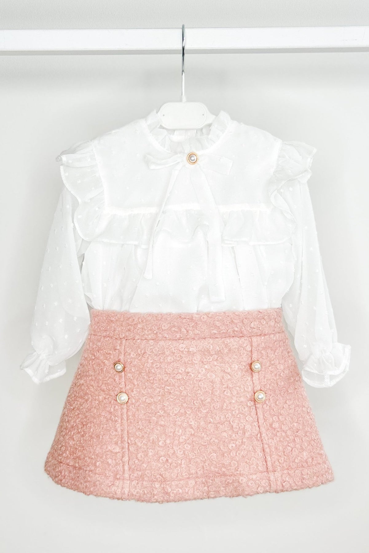 Girl's outfit set from Portuguese brand Puro Mimo. Lightweight ivory plumeti dot long-sleeve blouse with pretty ruffle around the chest and shoulders and a bow to the neck topped with a stylish gold and faux pearl button. Outfit is completed with a Gossip Girl-esque dusky pink bouclé mini skirt decorated with the same gold and faux pearl buttons.