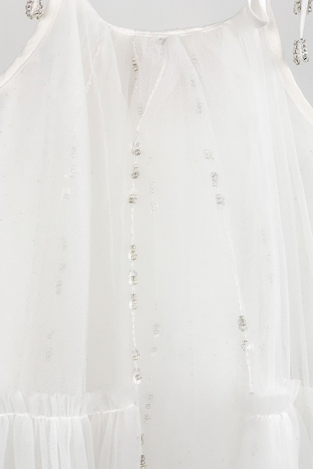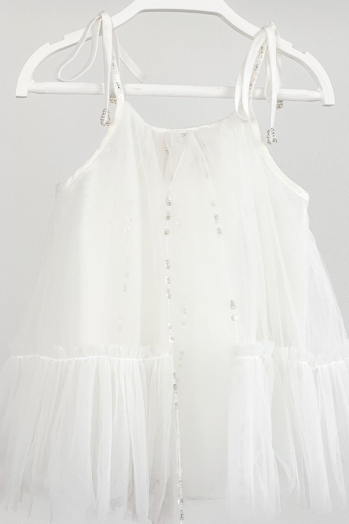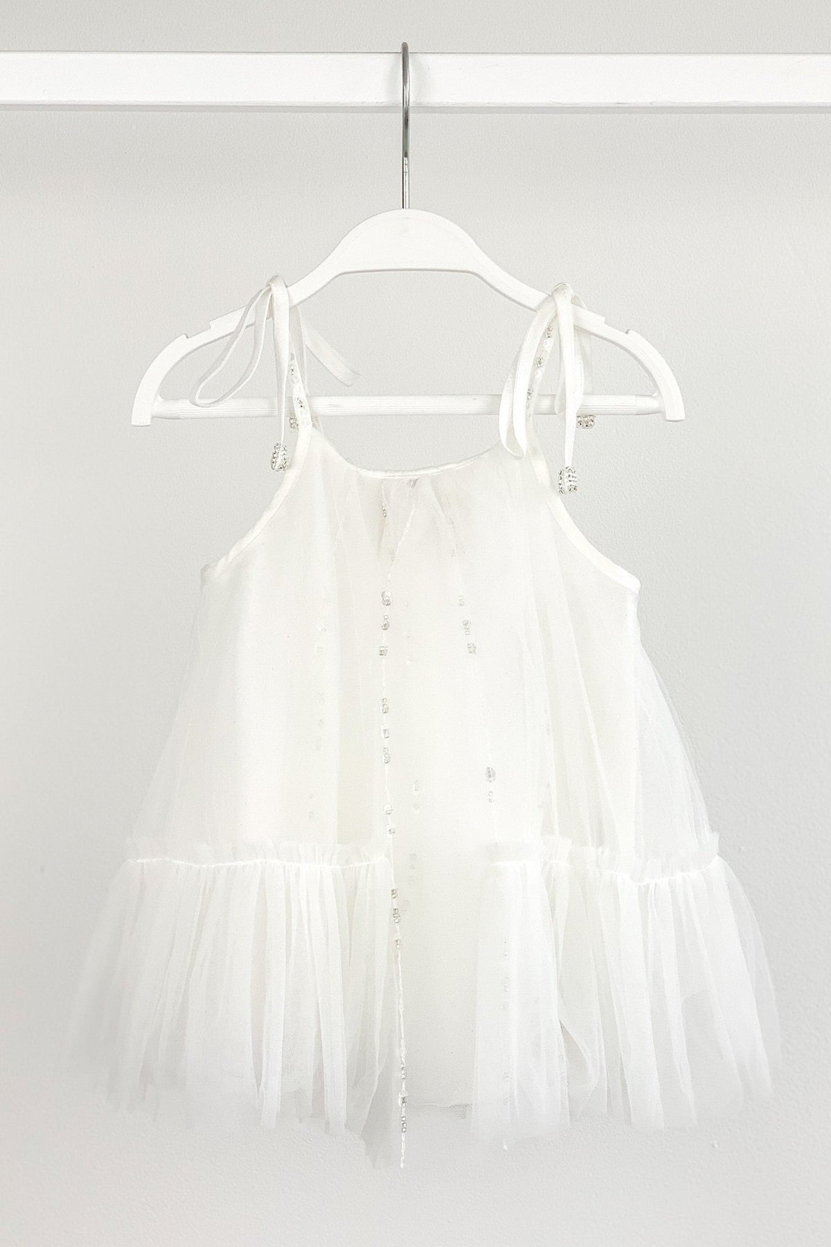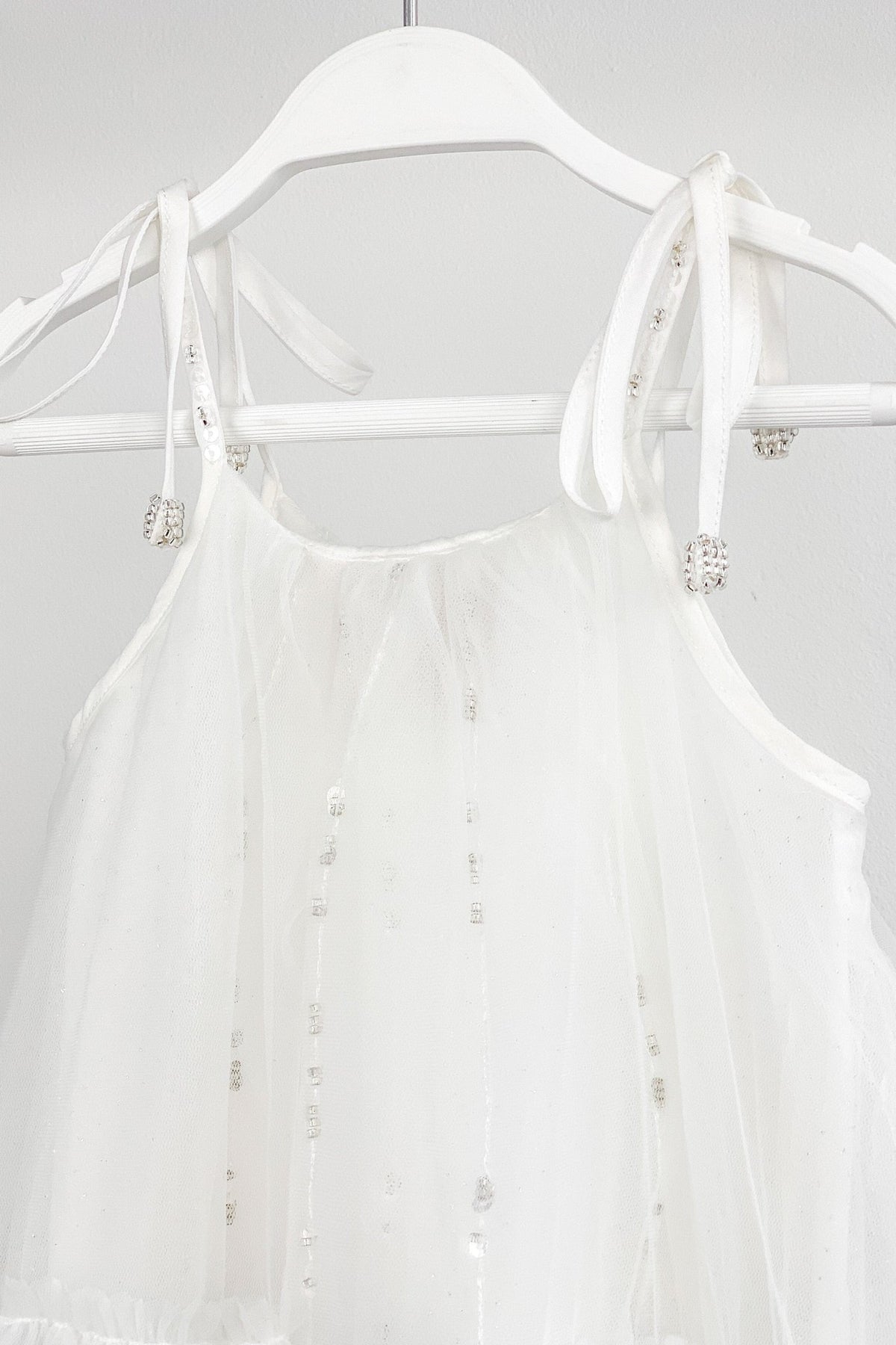 Stunning tulle dress from American designer Luna Luna Collection. White layered tulle dress with sparkly tulle layer, adorned with pretty hand beading, with pretty diamanté finished tie straps.