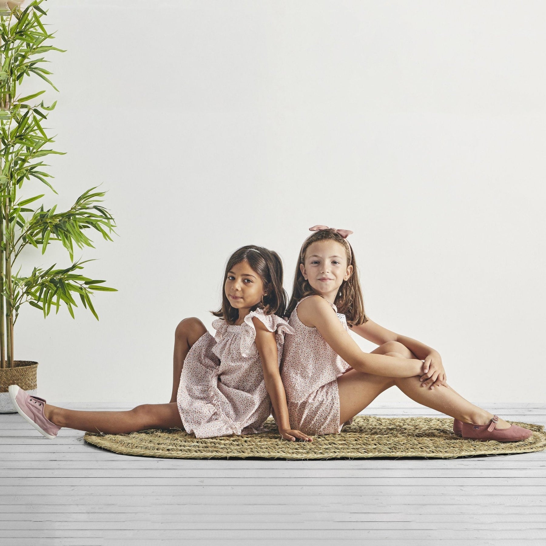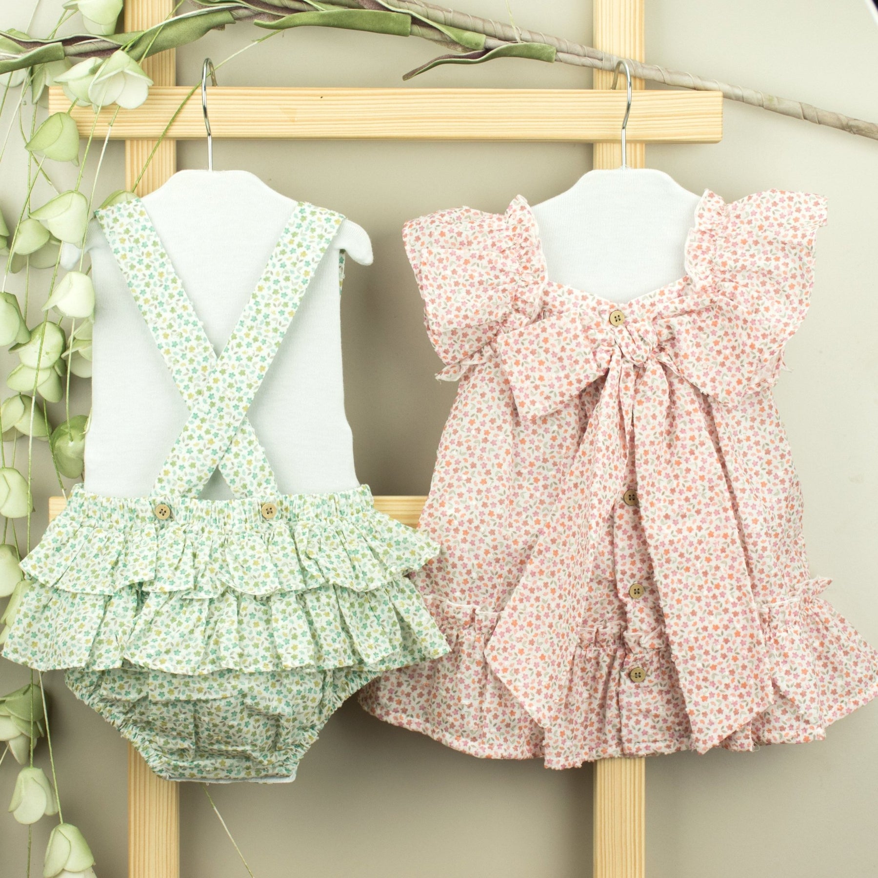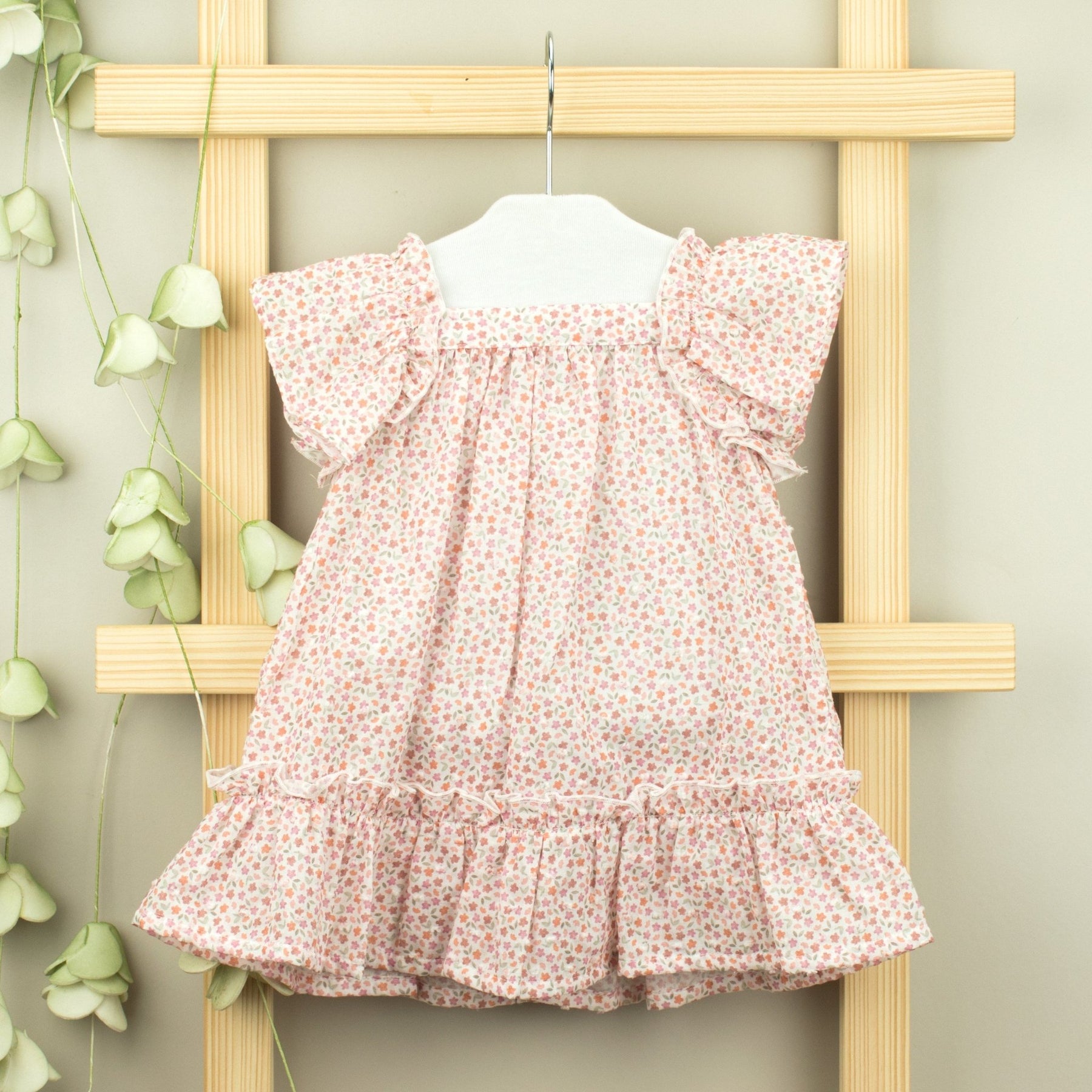 Adorable ditsy floral dress from Spanish designer Babidu. Delicate ditsy floral dress with cute ruffles to sleeves and hem, and a large bow to the back.
