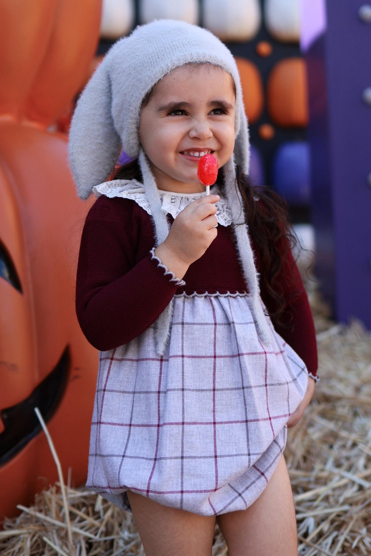 Baby girl's half knit romper from Spanish designer Granlei. Mid-weight burgundy knit long-sleeve romper with divine vintage-style lace collar, and soft, brushed cotton tartan body. Finished with a luxurious natural mother of pearl branded disc to the waist.