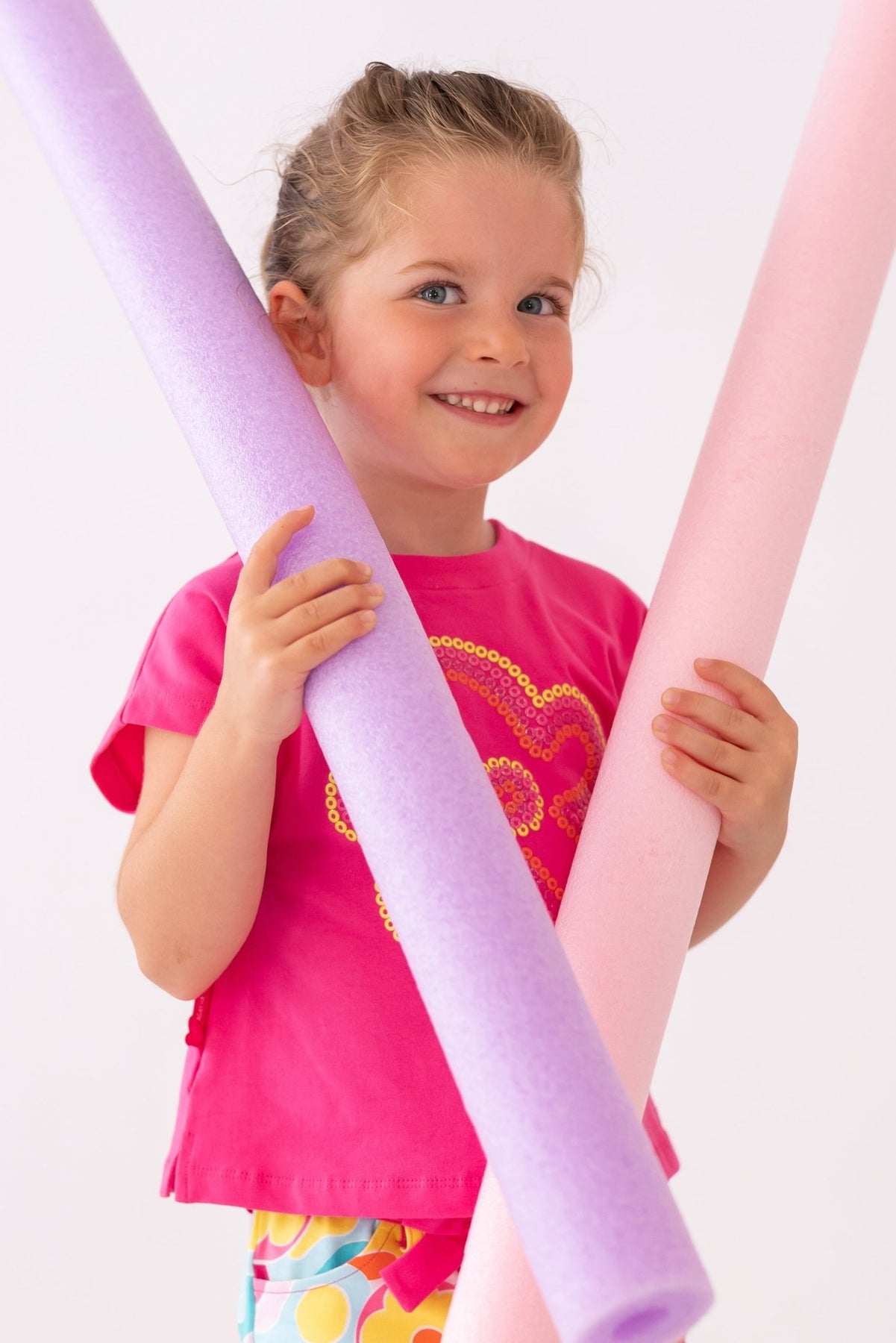 Brighten up her summer wardrobe with this ultra-fun two-piece set from Agatha Ruíz de la Prada. The fuchsia pink t-shirt is soft and stretchy with a glittery flower print that sparkles in the sunshine. Paired with multicoloured printed shorts featuring hearts, florals, and swirls, this set is perfect for playful days out. The shorts are finished with a cute bow, popper fastening, and adjustable waistband for a comfy fit all day long.