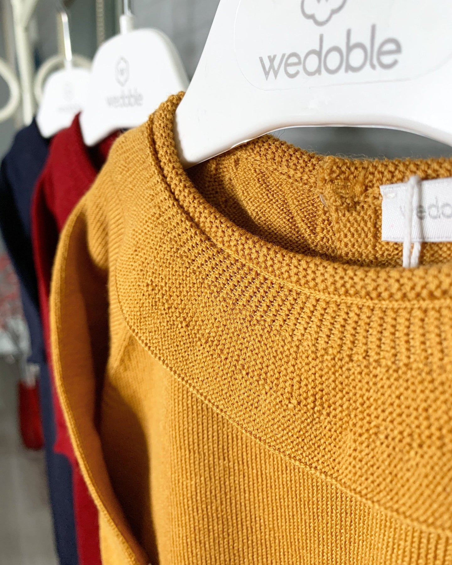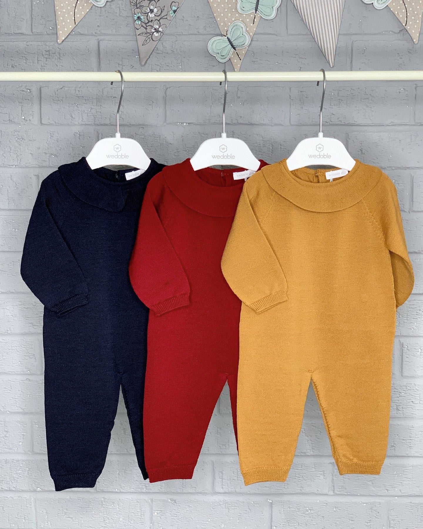 Cute knitted romper from Portuguese brand Wedoble. Lightweight woollen long-sleeve romper with adorable ruffle collar. Perfect for baby boys or girls. Choose from Navy, Burgundy or Mustard.