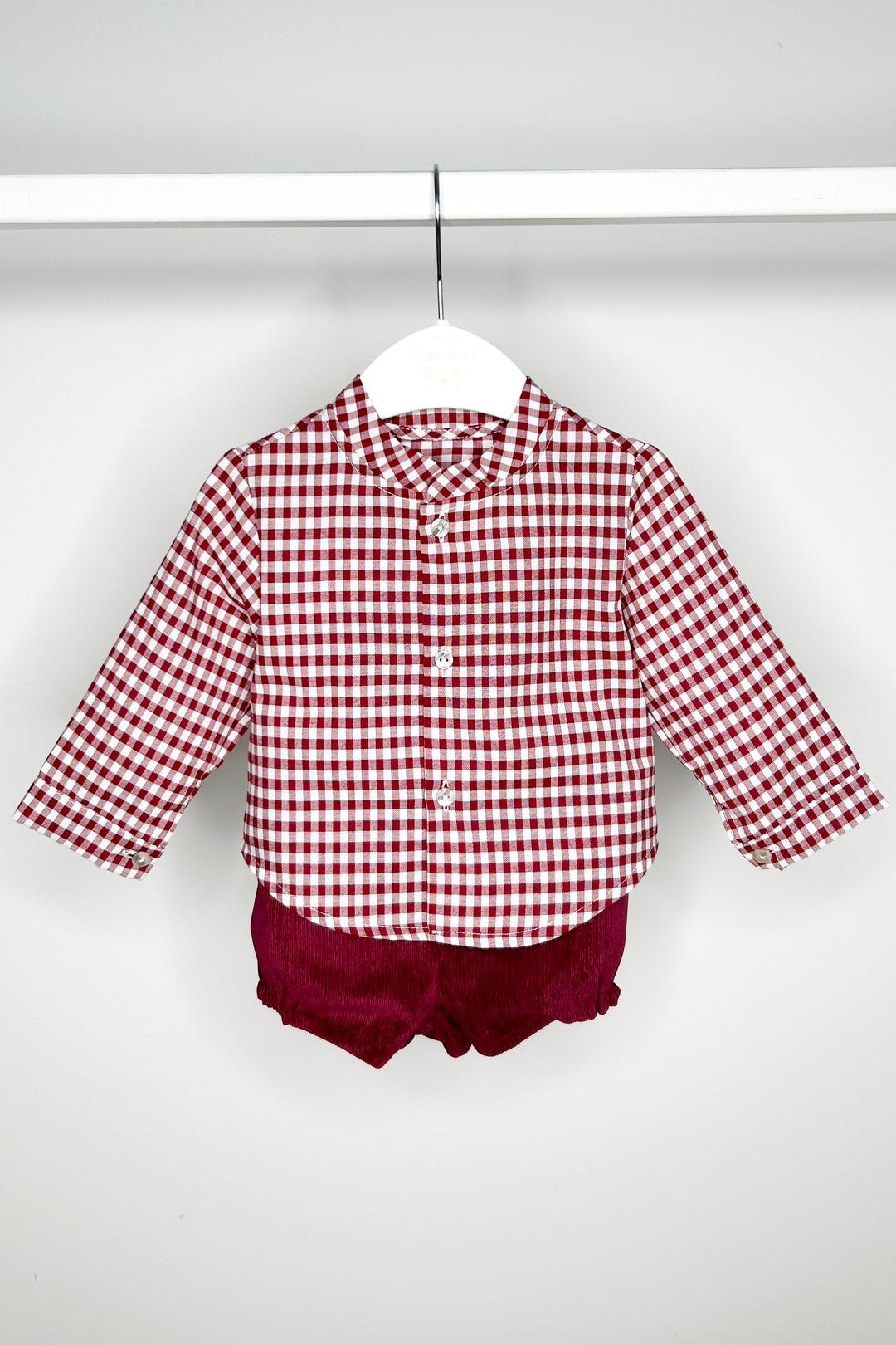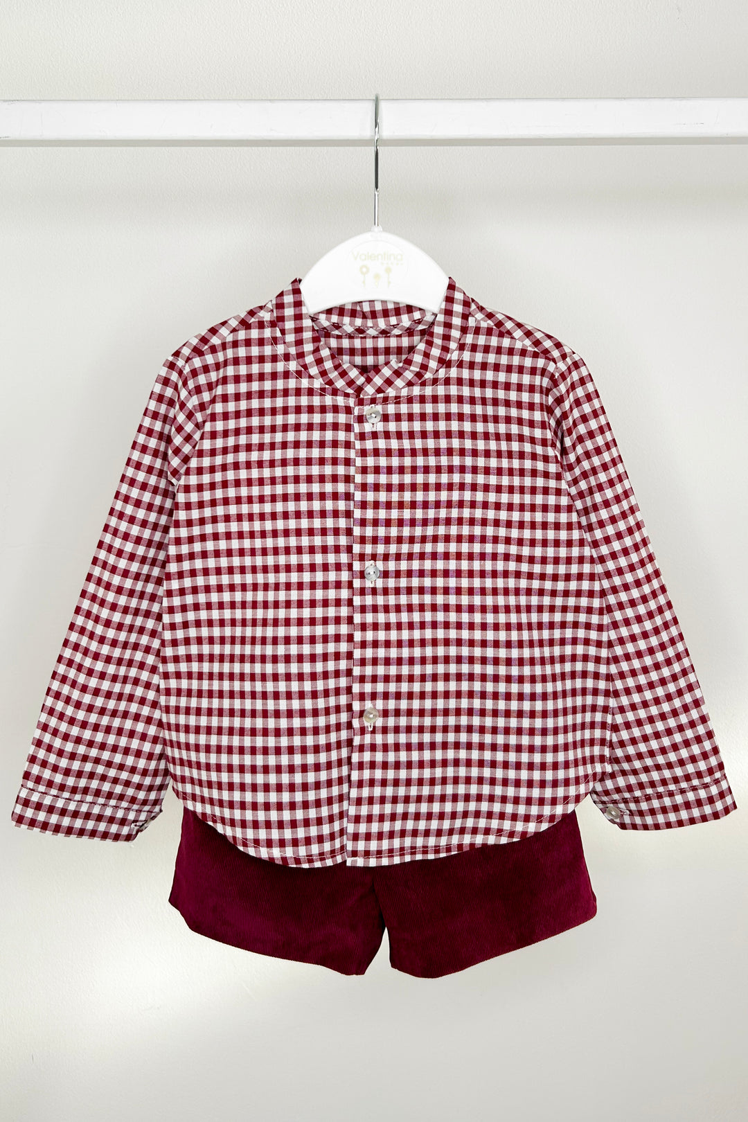 Baby boy's outfit set from Spanish brand Valentina Bebés. Lightweight burgundy gingham woven cotton long-sleeve shirt, paired with super soft burgundy needlecord shorts.