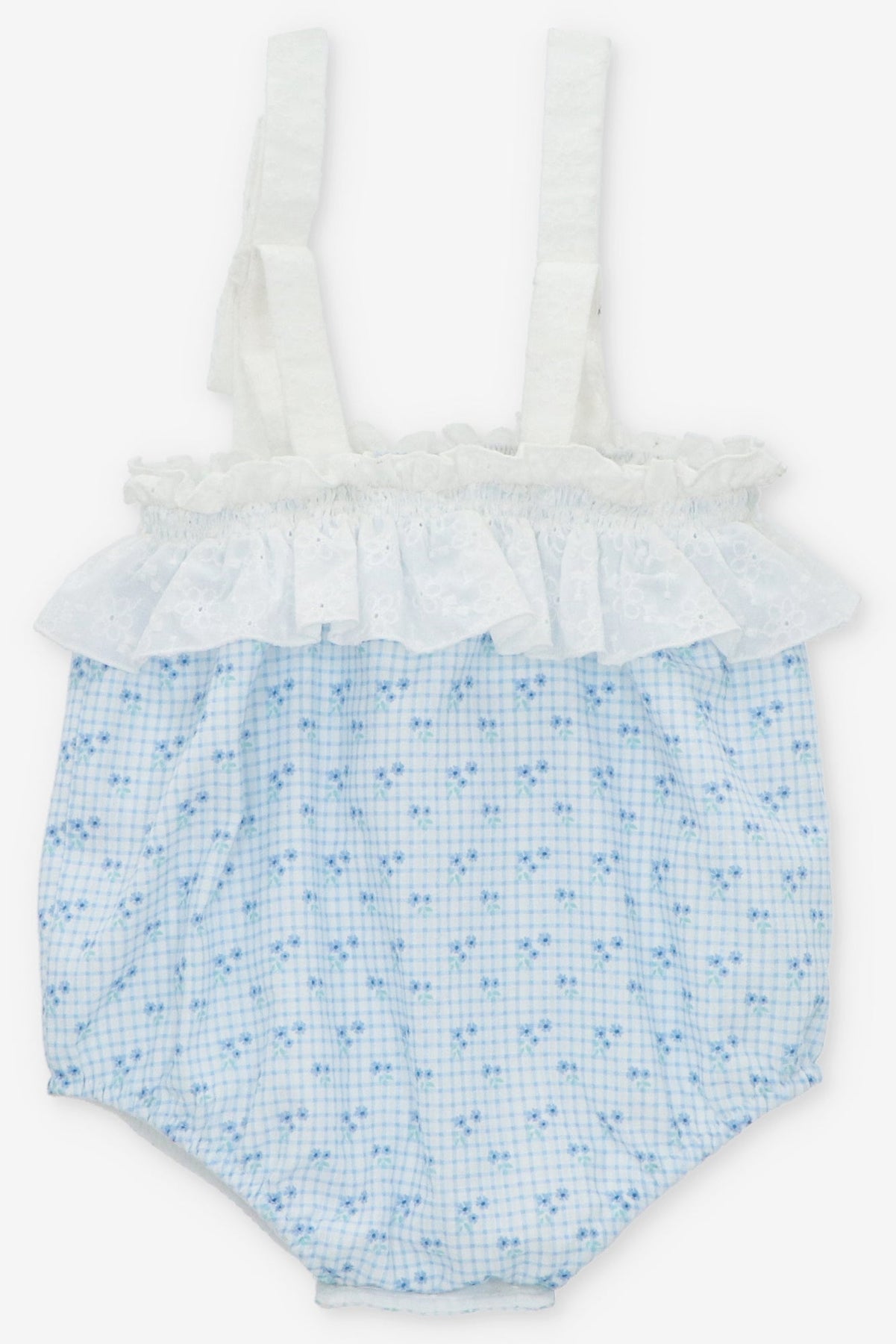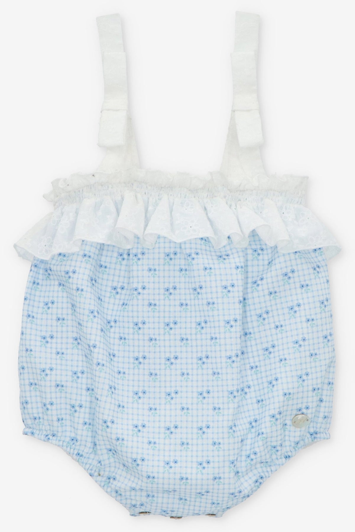 Baby girl's shortie from Martín Aranda. Lightweight dusky blue checked shortie adorned with adorable ditsy floral print, with white broderie anglaise straps topped with bows and ruffle around the chest. Finished with a luxurious natural mother of pearl branded tab.