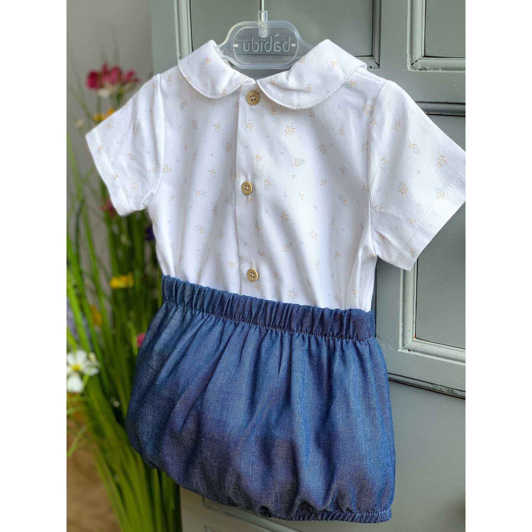 Cork button fastening down back of shirt for easy dressing. Elasticated waist and leg cuffs to jam pants for baby's comfort.