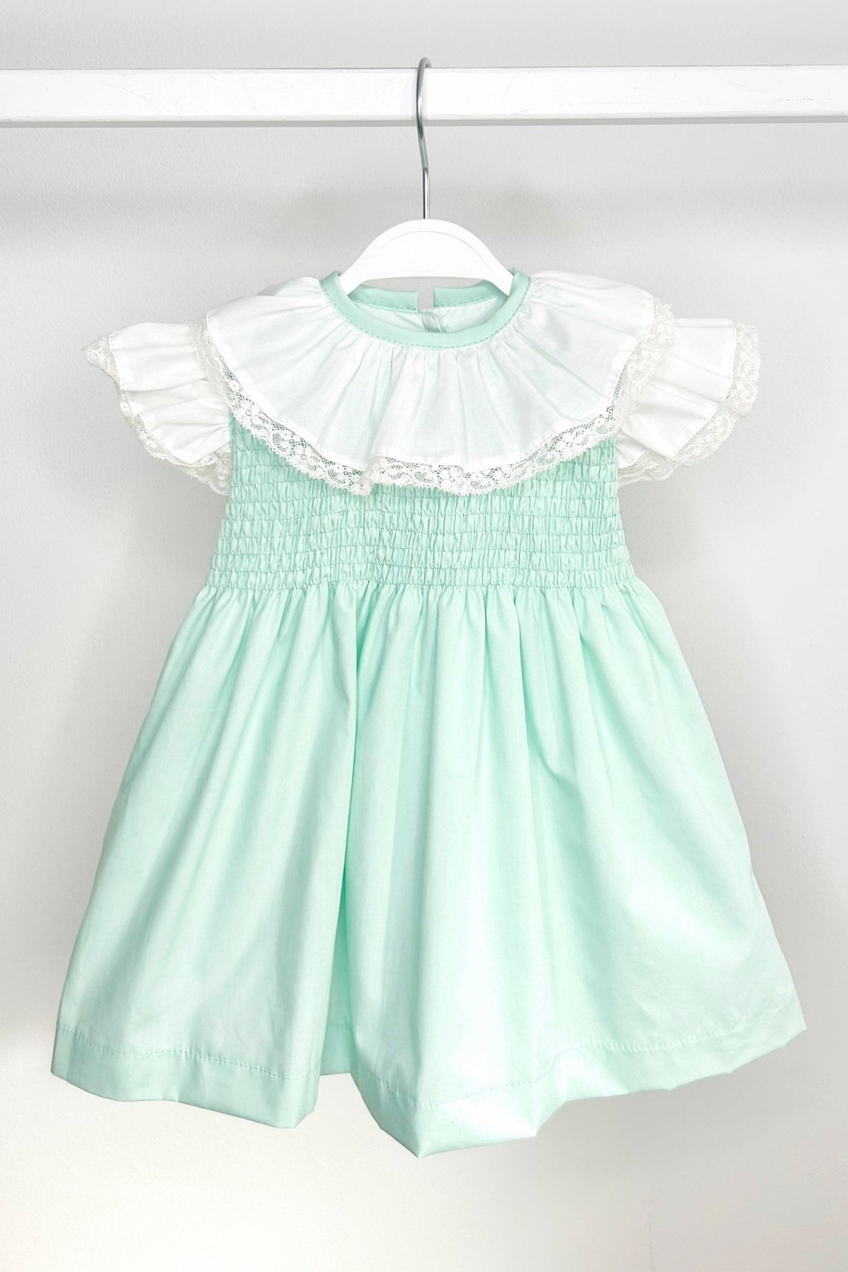 A little dress with big charm. This mint green beauty from Puro Mimo is crafted from soft, breathable cotton and features a shirred chest for comfort and stretch. The standout ivory ruffle collar is trimmed with delicate lace for a touch of vintage sweetness, while the oversized bow at the back adds an extra dose of magic. Fully lined and fastened with buttons to the back, it’s a dreamy piece for warm days and special occasions alike.