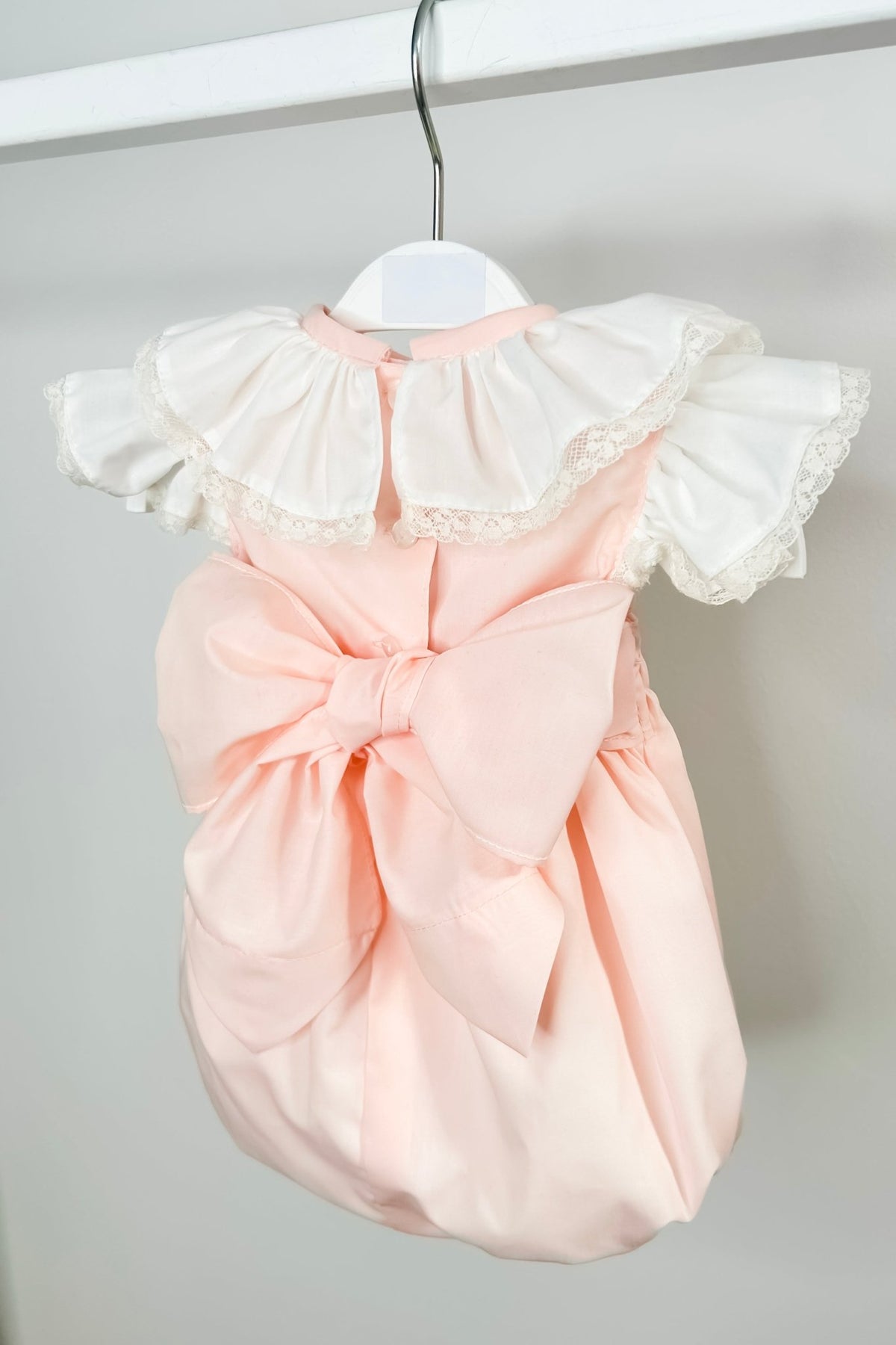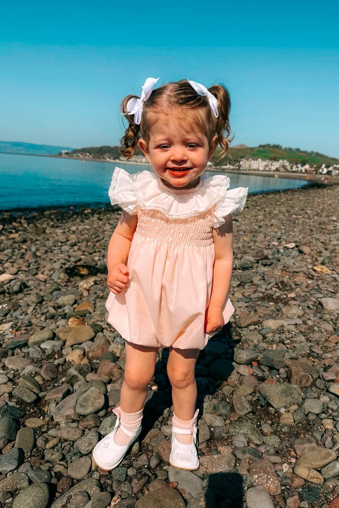 Soft, sweet, and made for sunshine—the Olivia romper from Puro Mimo is a dreamy addition to your little one’s wardrobe. With a gently shirred bodice, layers of lace-trimmed ruffles, and an oversized bow that makes the sweetest statement from behind, every detail is designed to delight. Lined for comfort and finished with practical button fastenings, it’s as functional as it is beautiful.