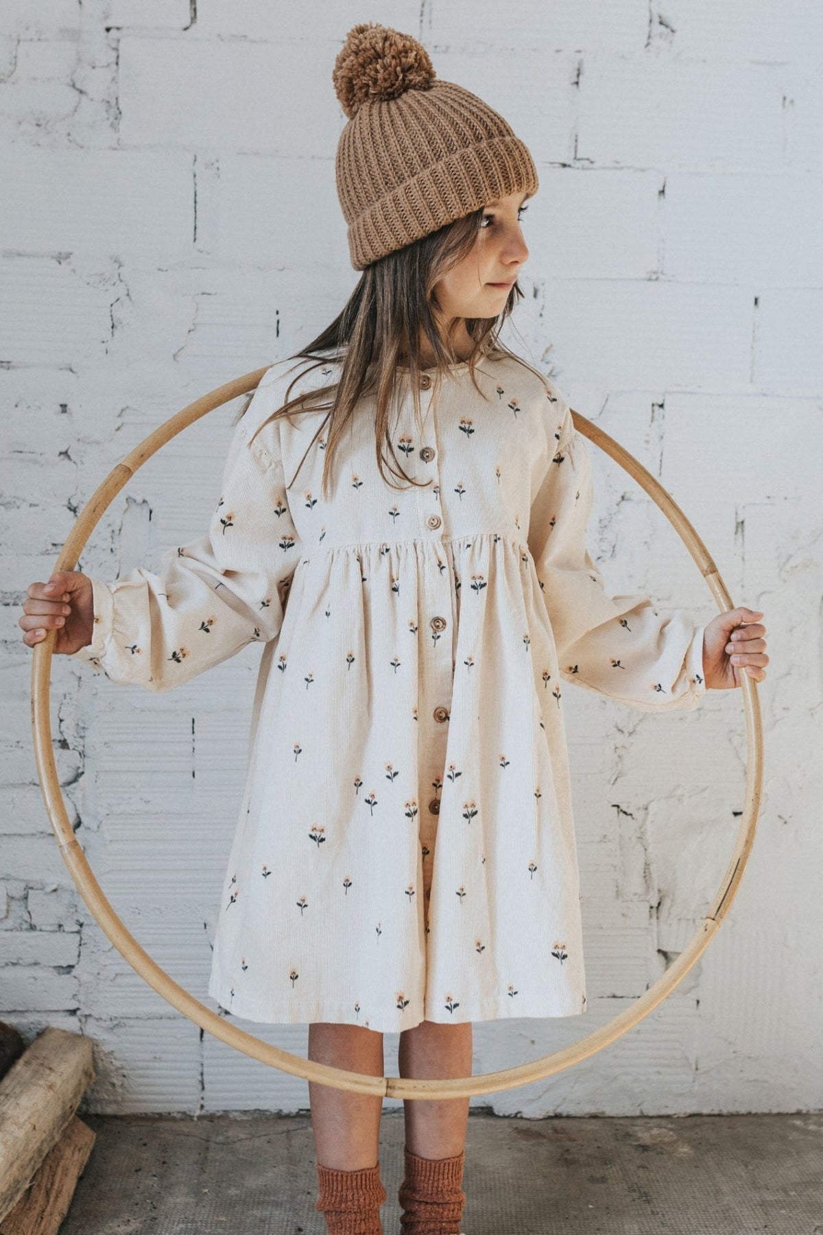 Girl's dress from Spanish brand Búho. Super soft, lightweight needle cord long sleeve dress decorated with pretty embroidered flowers.