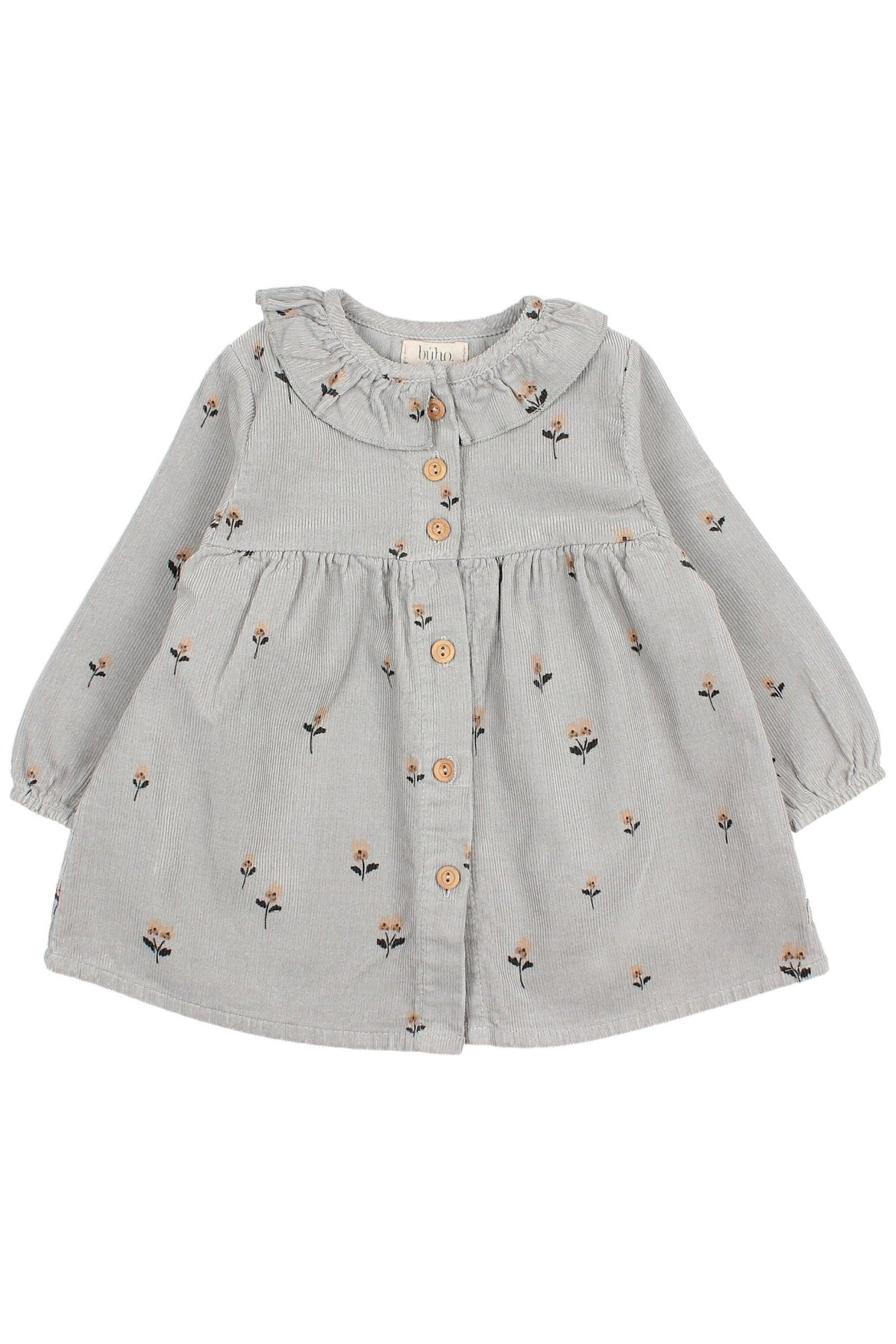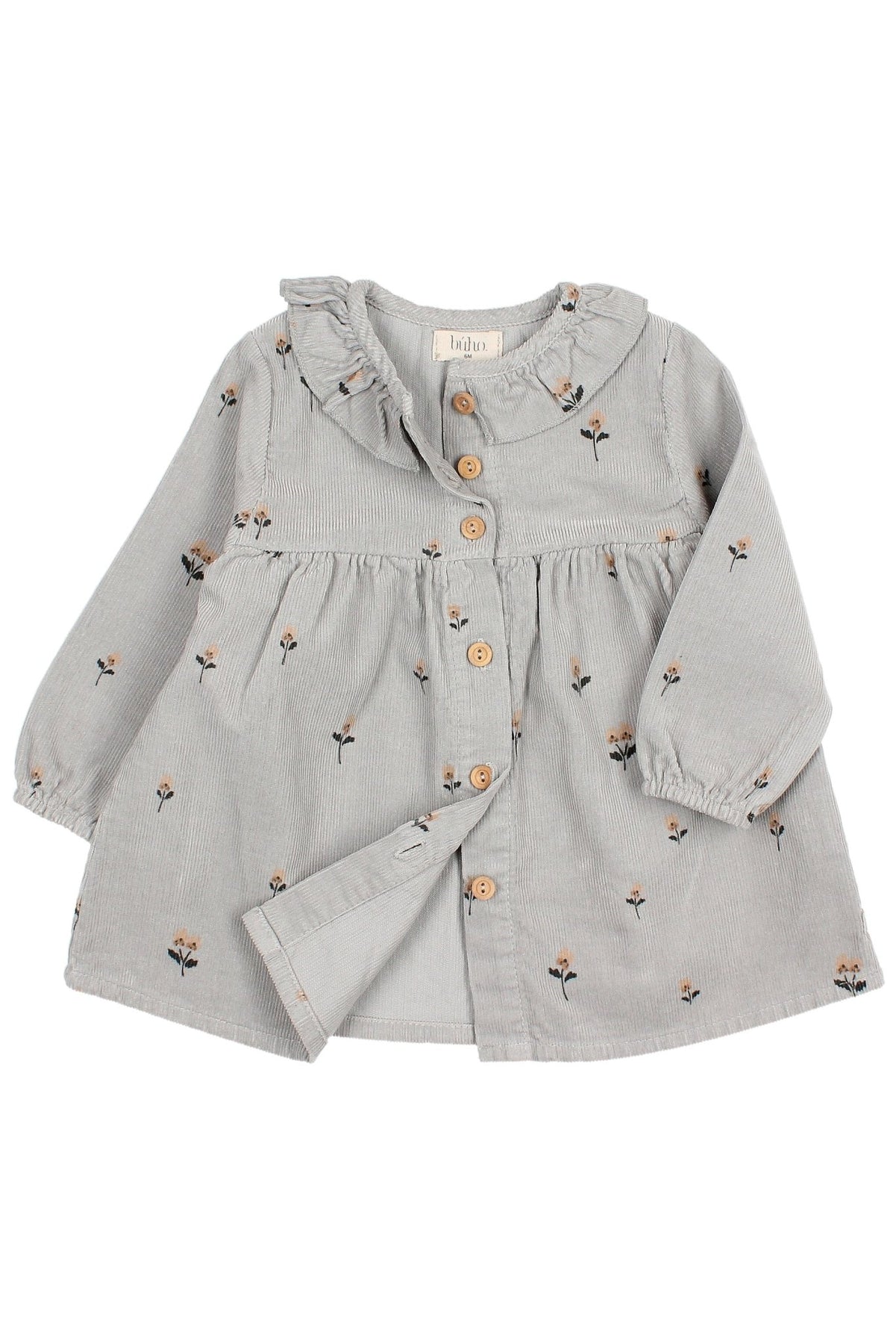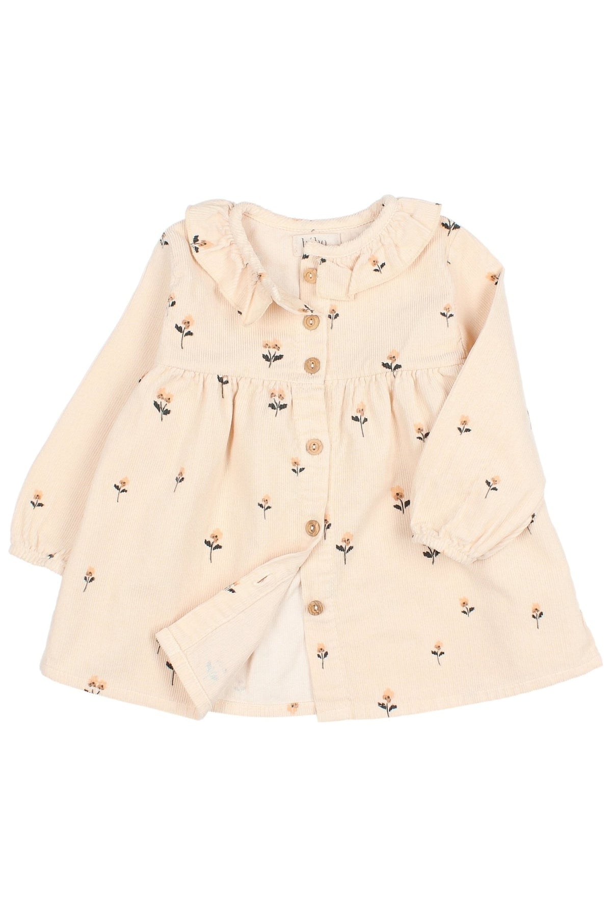 Baby girl's dress from Spanish brand Búho. Super soft, lightweight needle cord long sleeve dress with pretty embroidered flowers and ruffle collar.
