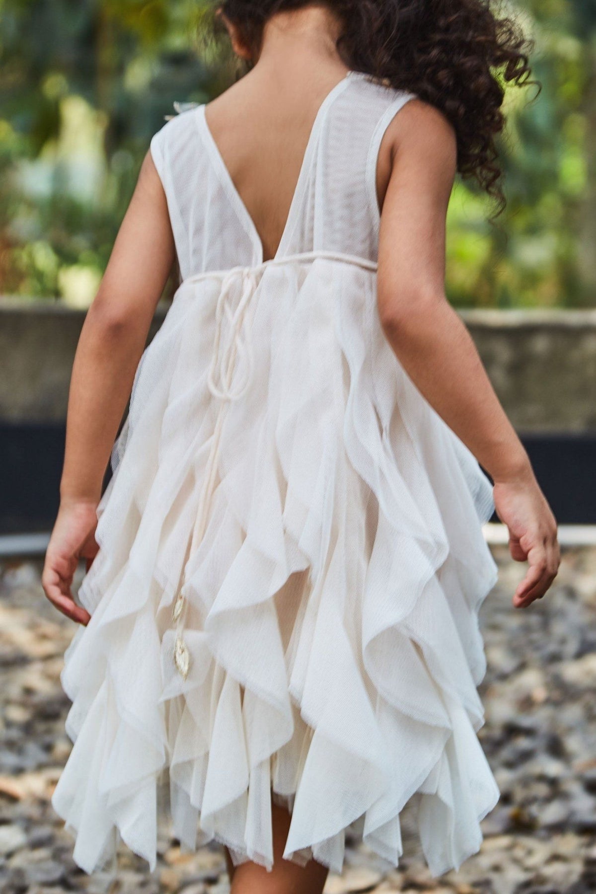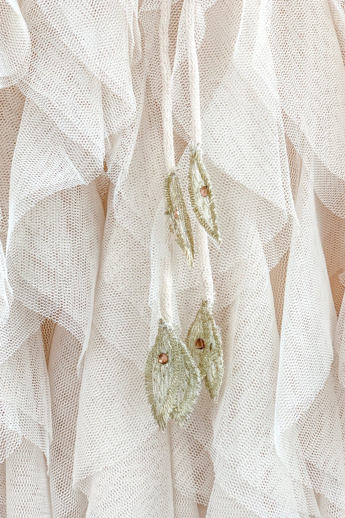 Stunning tulle dress from American designer Luna Luna Collection. Stone/white dress decorated with beautiful gold flower appliqués adorned with rhinestones to the bodice, with extravagant cascading tulle skirt. Cotton slip lining. Choose from Stone or White.