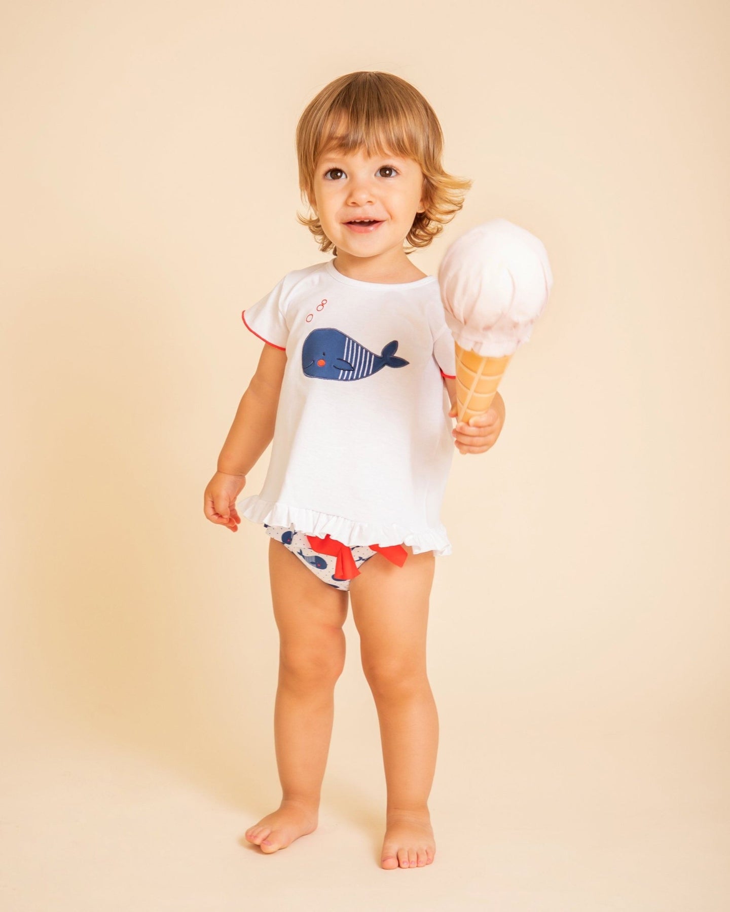 Adorable swimwear set from Spanish brand Calamaro. Lightweight white cotton t-shirt with beautiful draped back and frilled hem decorated with cute whale motif to the centre, paired with whale print frilled bikini bottoms, decorated with a large red bow.