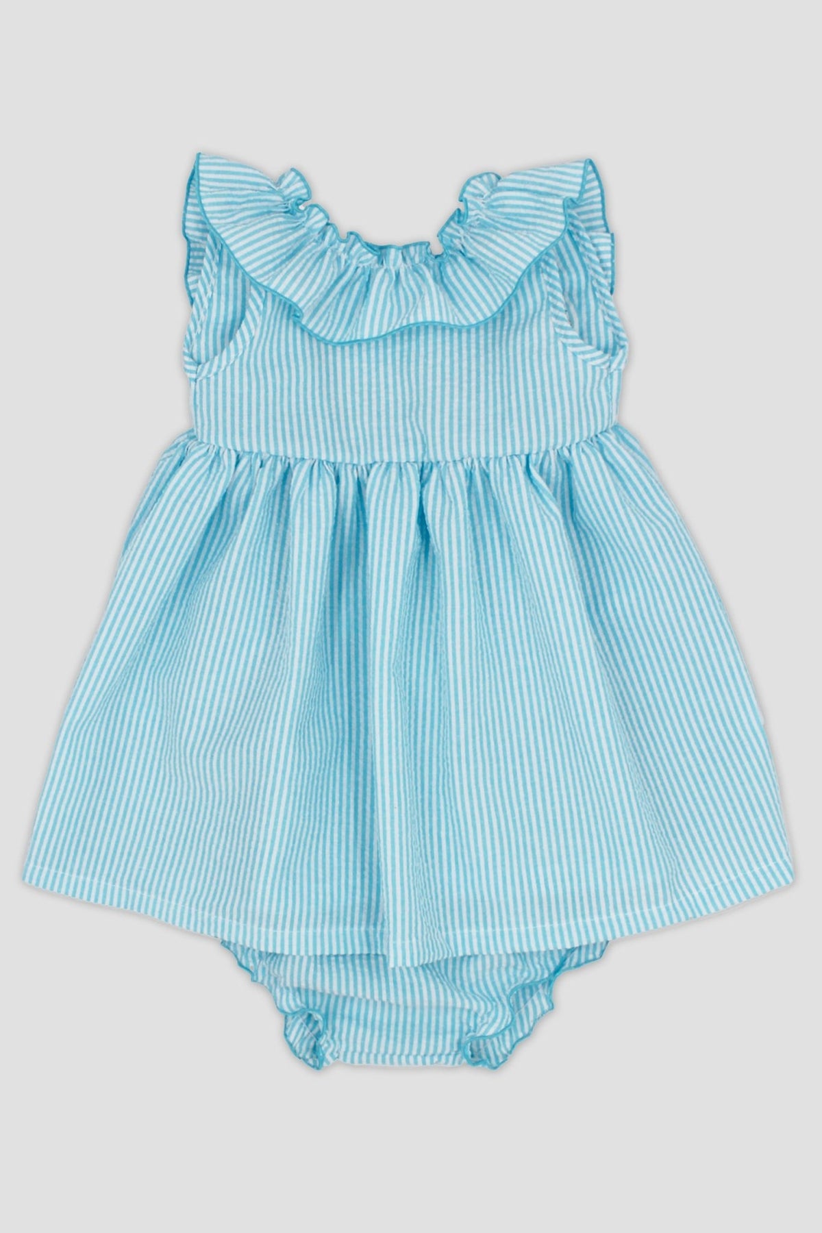 This charming dress and bloomers set from Rapife for baby girls combines comfort and style. The dress is made from super lightweight turquoise and white seersucker fabric and features a cute ruffle collar, an elasticated waist, and a stylish cut-out back. The matching bloomers have an elasticated waist and legs for comfort and a secure fit. This set offers both a playful and fashionable look for warmer days.