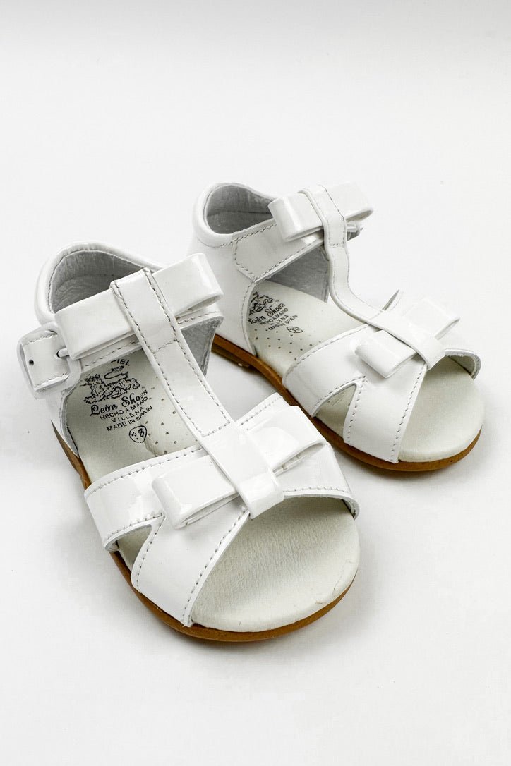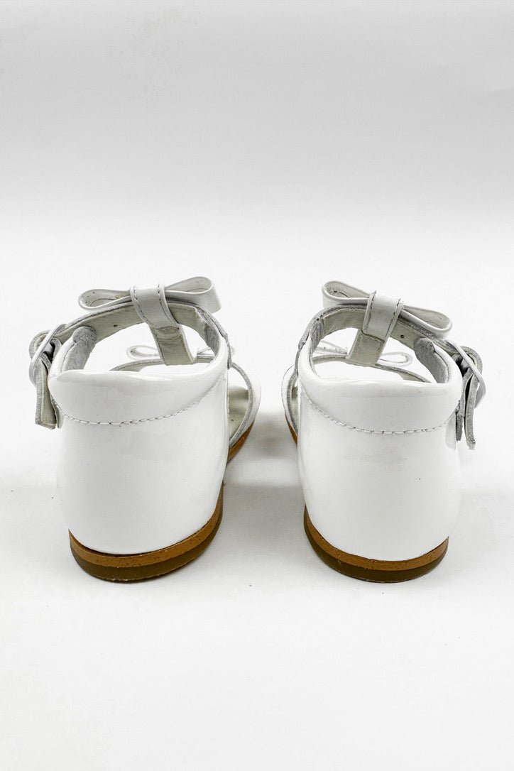 Hand crafted white patent leather sandals from Spanish brand León Shoes. With adjustable buckle fastening, lightly cushioned heel and a non slip sole.