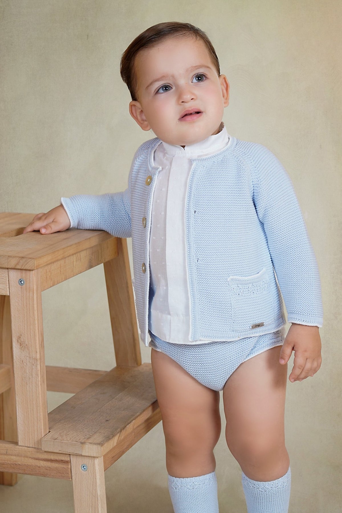 This beautifully coordinated three-piece set from Rahigo is a timeless choice for baby boys, perfect for warmer days and special occasions. Knitted in classic baby blue with crisp white trims, the cardigan features natural mother of pearl button fastenings down the front and a gently structured knit that holds its shape well. It’s layered over a lightweight white woven cotton shirt with subtle plumeti dot detailing for a traditional finish. The matching knitted jam pants feature an elasticated waist and legs for comfort and ease of movement, creating a polished yet practical outfit.