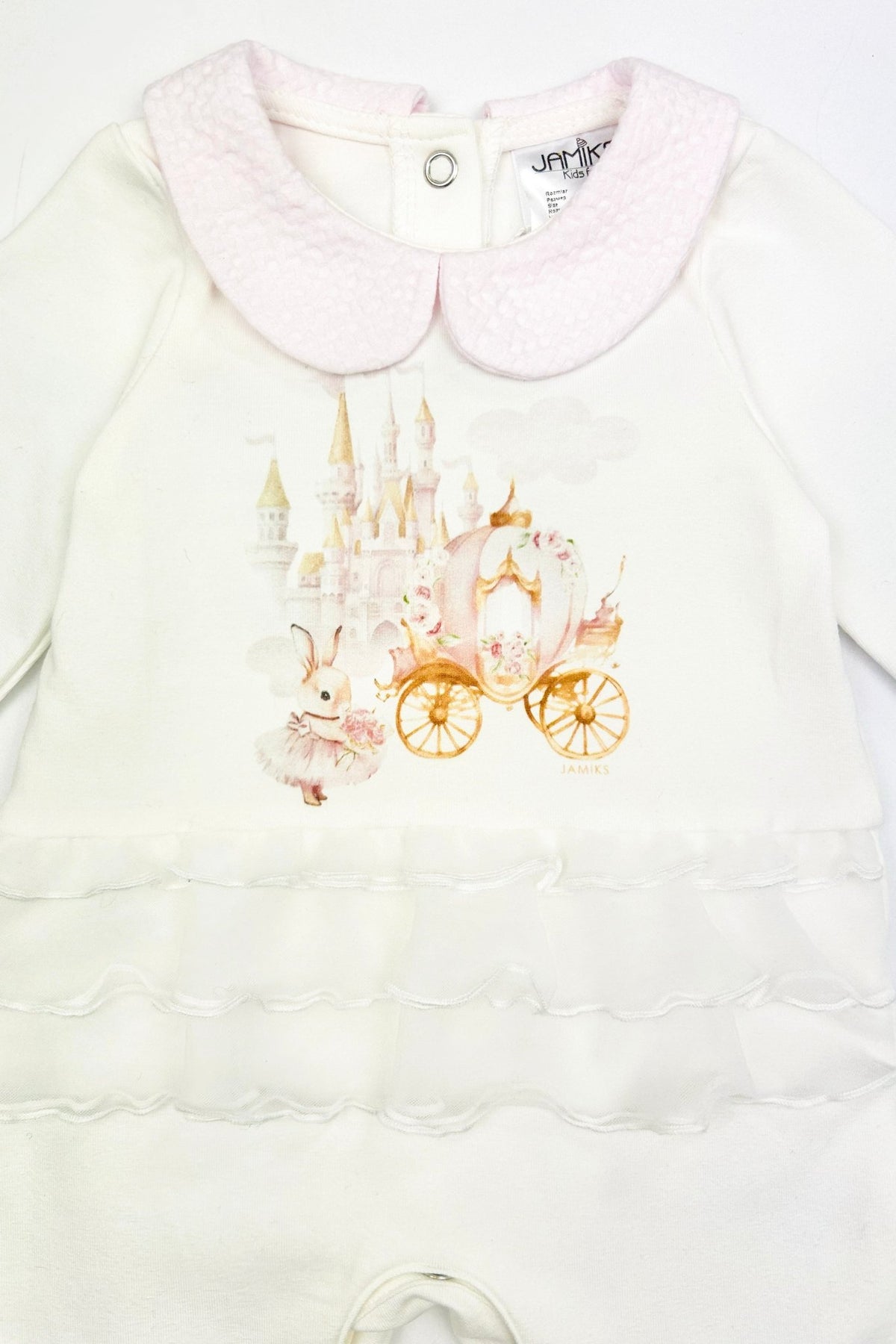 A touch of fairytale magic for your baby girl's wardrobe, this dreamy ivory sleepsuit by Jamiks is as precious as it is practical. Featuring an enchanting bunny and carriage print beneath a majestic castle, it’s finished with a pink textured collar and delicate organza frills at the waist – like a tutu fit for a tiny princess. Crafted from soft, stretchy cotton for all-day comfort and detailed with poppers to the back and legs for ease of dressing.