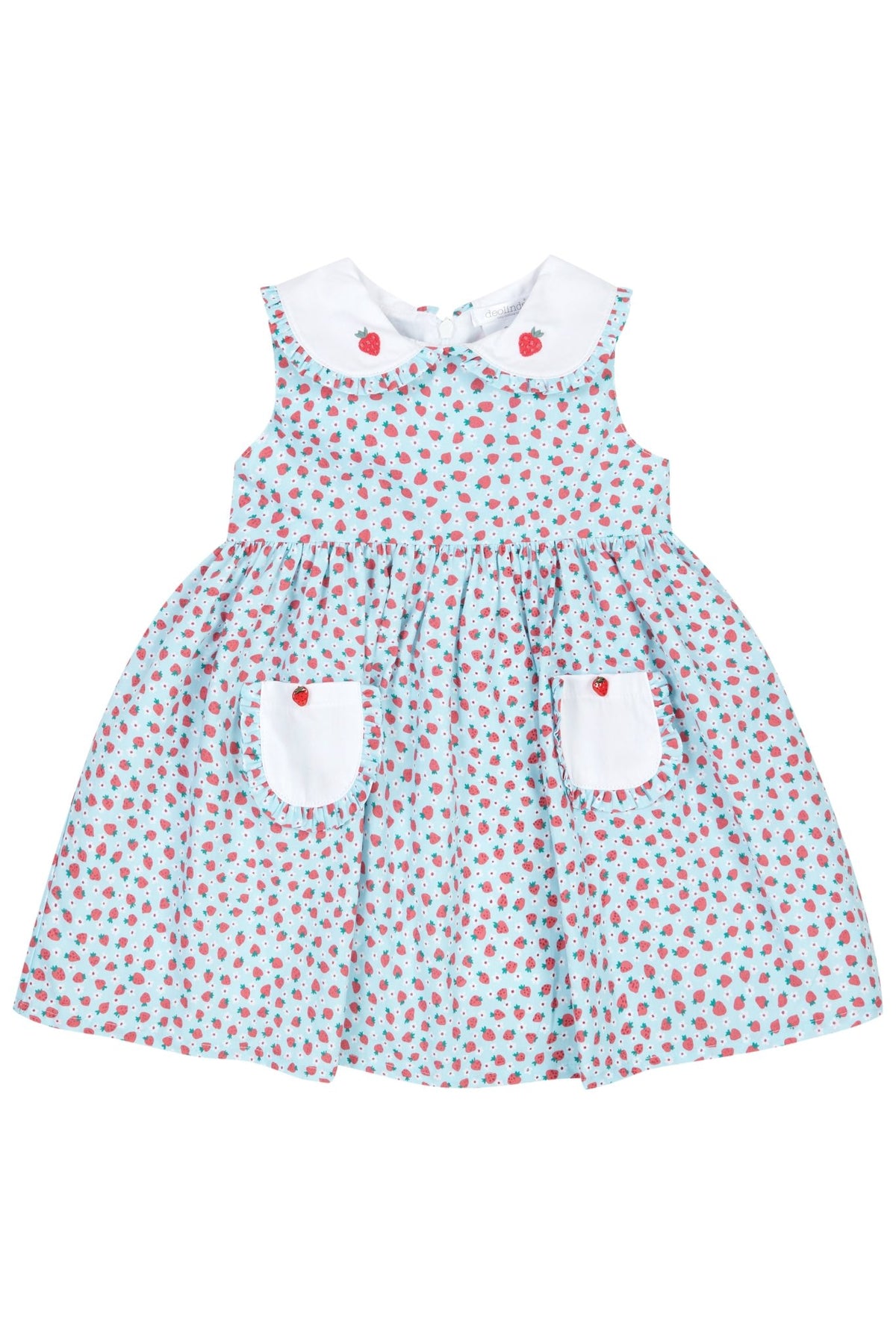 Girl's dress from Portuguese brand Deolinda. This lightweight blue and red strawberry print dress is a sweet treat with playful strawberry embroidery to the collar and two adorable white frilled pockets decorated with red strawberry buttons to the skirt - it's berry cute.