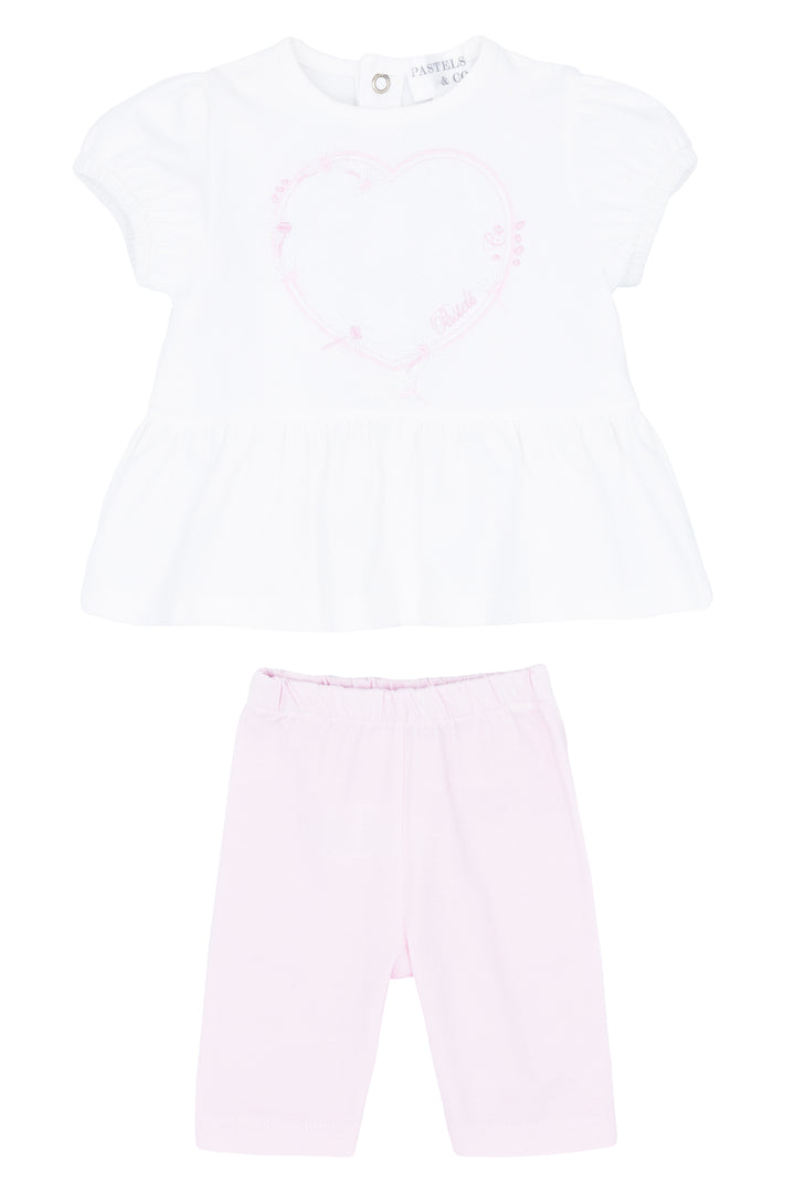 Baby girl's outfit set from British brand Pastels & Co's Spring/Summer '24 collection. Soft, super lightweight, stretchy white blouse with pretty pink embroidered daisy chain heart to chest, paired with pink cropped leggings.