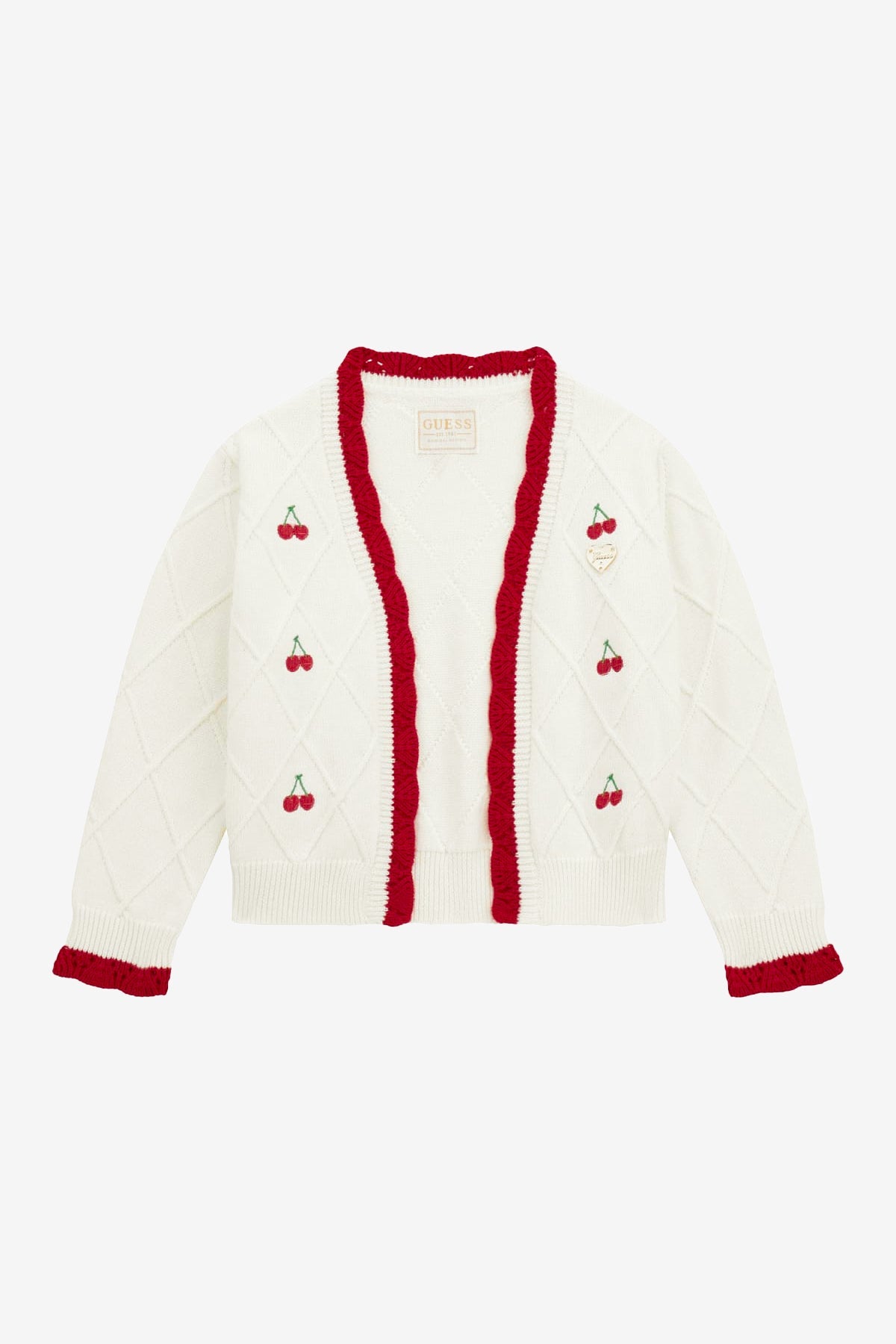 A sweet layer for cooler days, this ivory knitted cardigan from GUESS® Kids is beautifully soft and decorated with dainty embroidered cherries and rich red scalloped trims. Finished with a little gold Guess heart, it’s the perfect lightweight cover-up to pair with any outfit from the cherry collection.