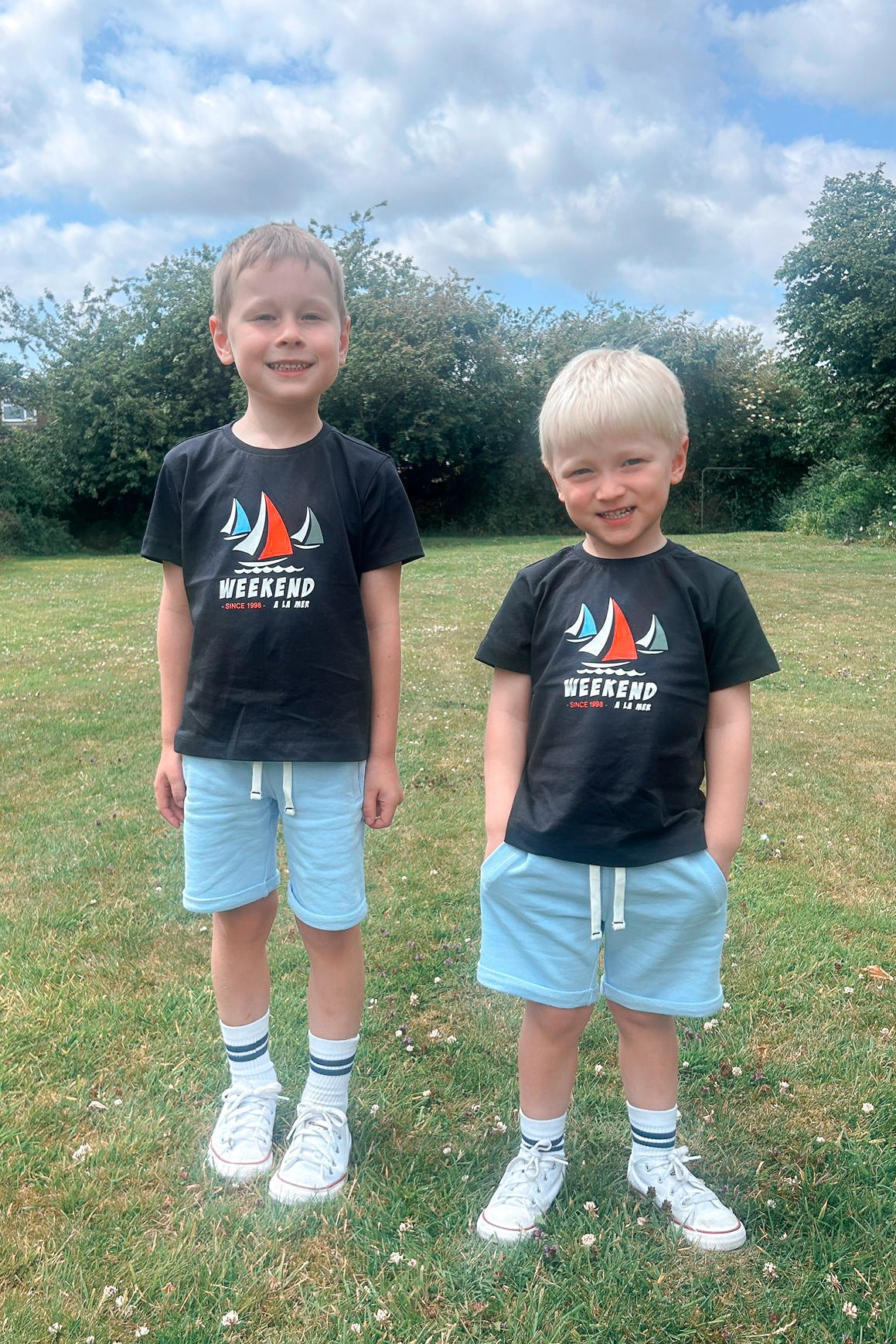 Set sail for summer fun with this nautical-inspired outfit by Week-end à la Mer. The soft navy t-shirt features a colourful sailboat print that captures the spirit of seaside adventures, while the sky blue shorts are crafted from a slightly heavier cotton for durability and comfort. With an elasticated waistband, contrast navy drawstring and smart turned-up cuffs, these shorts are as practical as they are stylish. Whether they're heading to the coast or playing at the park, this set is ready for sunny-day escapades.