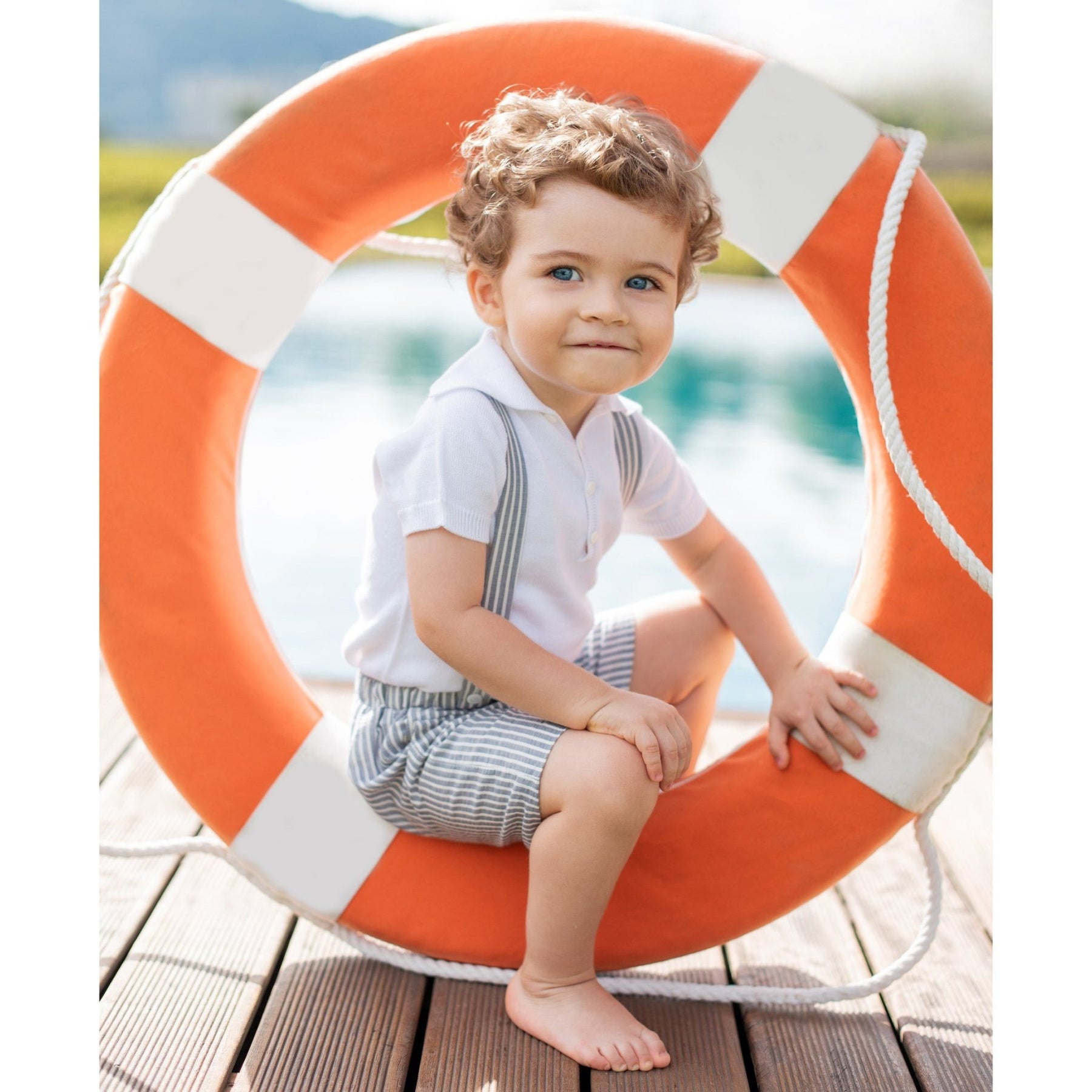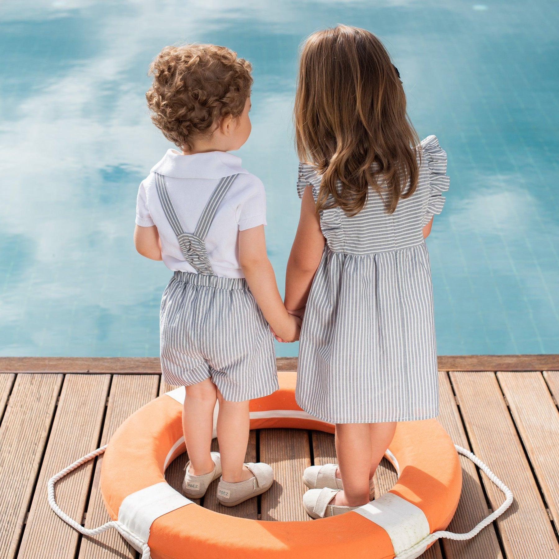 Smart striped shorts from Portuguese brand Wedoble. Soft, lightweight cotton pinstripe shorts with braces and pockets. Choose from Mint Green or Denim Blue.