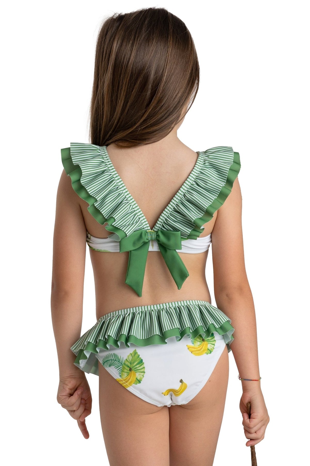 Girl's tropical print bikini from Portuguese brand Meia Pata. Soft white, yellow and green banana leaf print lycra bikini with double layered ruffle collar, crossover straps and frill to waist, finished with a large green bow to the back.