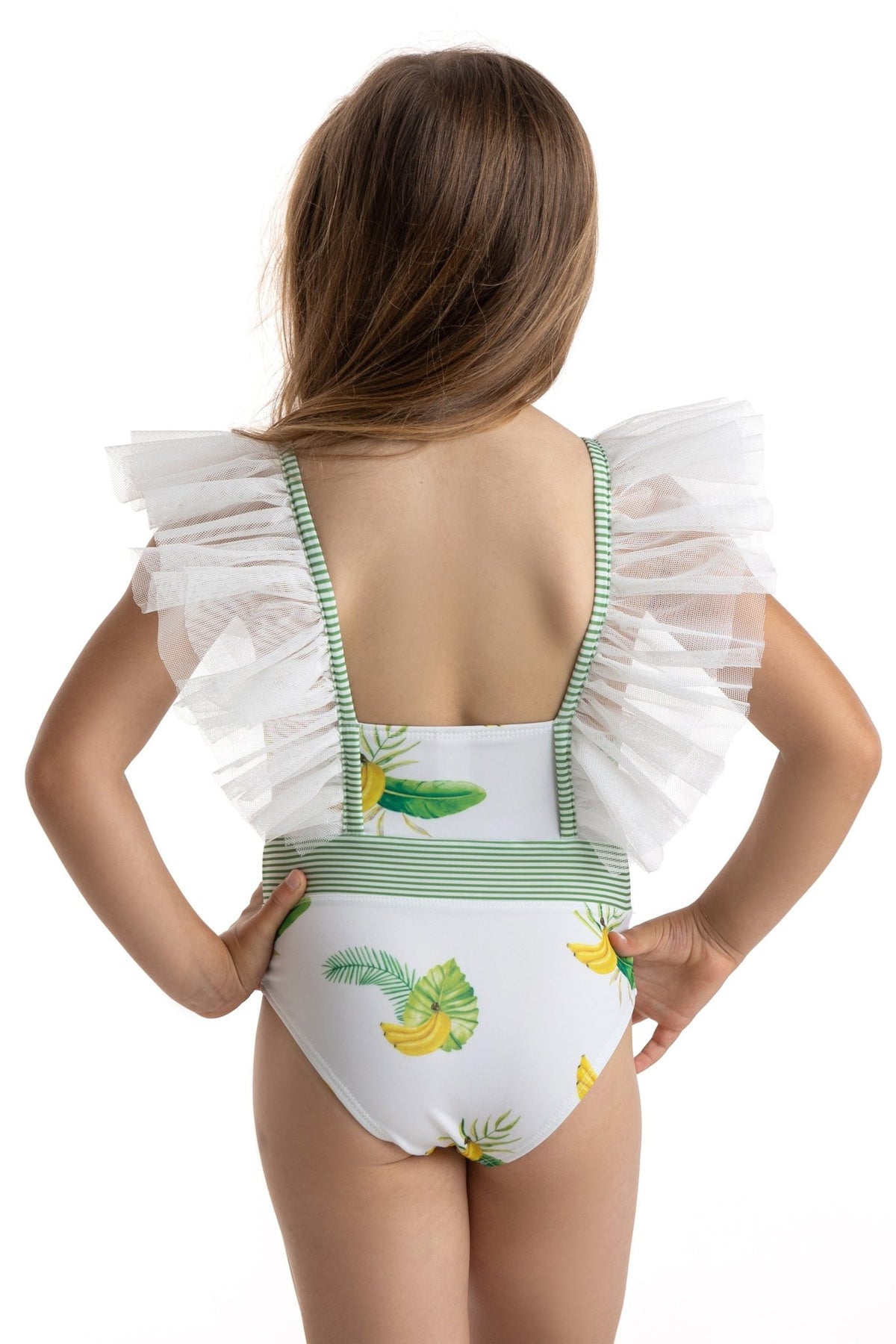 Girl's tropical print swimsuit from Portuguese brand Meia Pata. Soft white, yellow and green banana leaf print lycra swimming costume with girly white tulle frills over the shoulders.