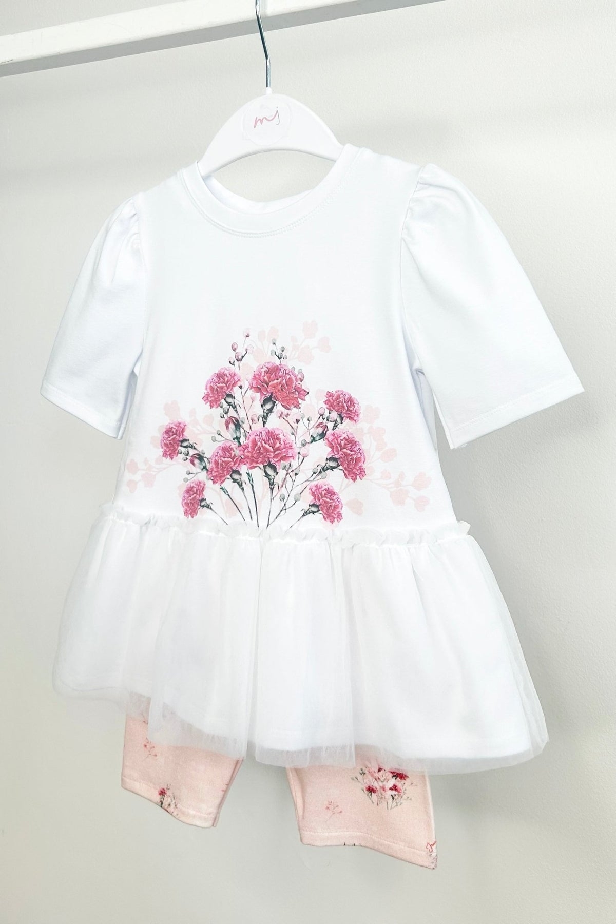 Fresh and feminine, this floral top and shorts set by Jamiks is perfect for playdates and warm-weather days. The crisp white top features a striking fuchsia pink flower bouquet print on the chest, with a soft tulle peplum-style drop waist that adds gentle volume and charm. It’s paired with delicate pink floral print biker shorts in a super soft bamboo viscose blend with a stretchy elasticated waistband for all-day comfort.