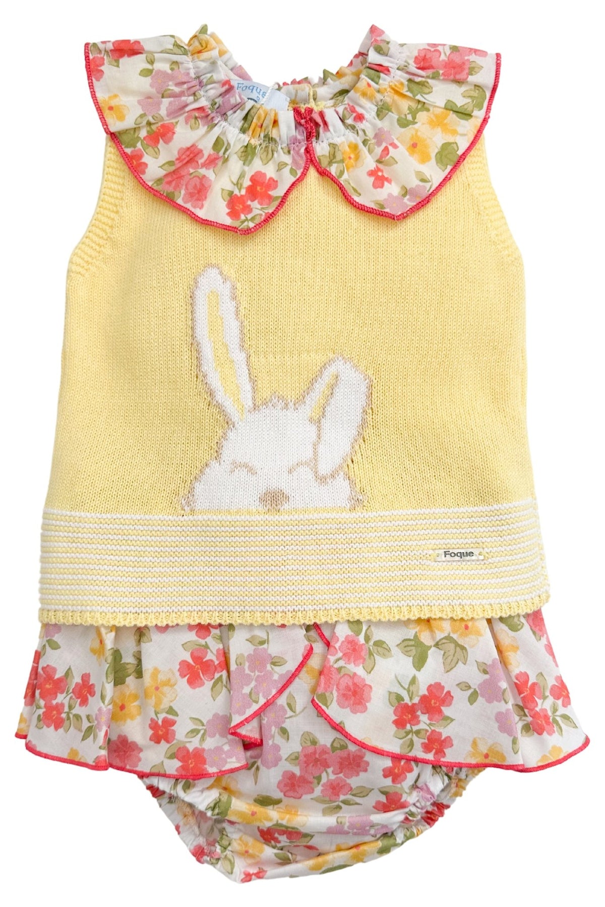 Baby girl's knit outfit set from Spanish brand Foque. Lightweight lemon knitted sleeveless top with bunny head motif to the chest and girly fuchsia floral collar, paired with matching fuchsia floral bloomers. Finished with a luxurious natural mother of pearl branded tab.