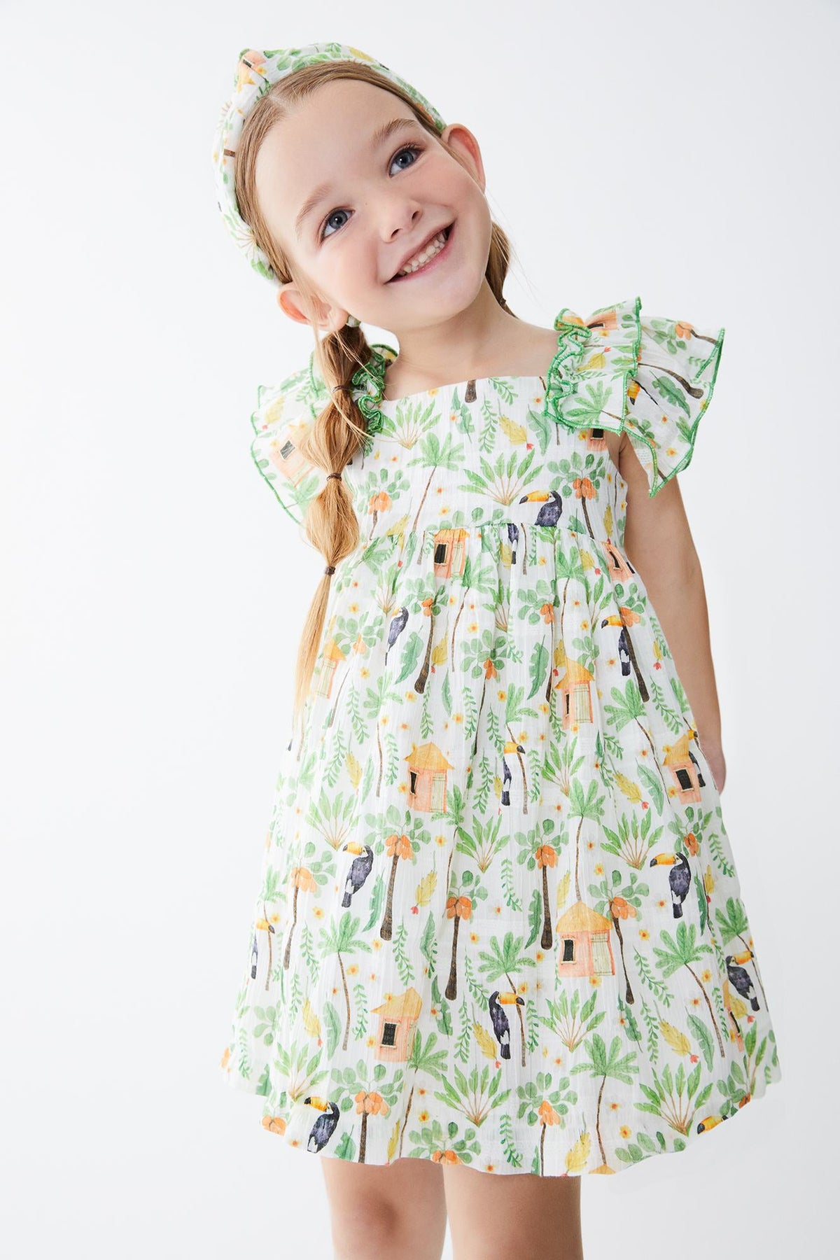 Girl's dress from Spanish brand Tartaleta. Super lightweight jungle print cheesecloth cotton dress with large flutter sleeves and stylish scoop back.