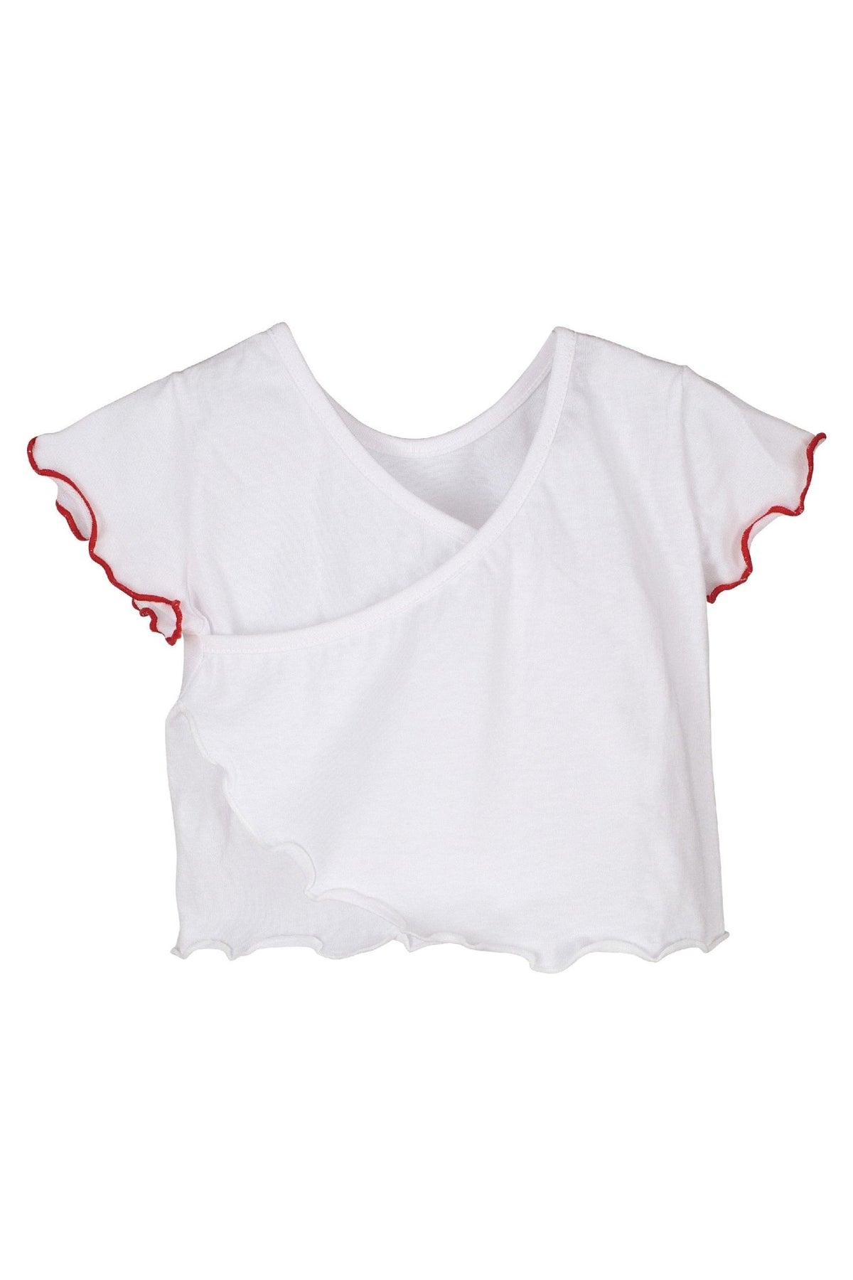 Girl's swimwear set from Spanish brand Calamaro. Super lightweight white cotton t-shirt with frilled sleeves and stunning draped back, and "Free Hugs" cactus embroidery to chest, paired with green cactus print bikini bottoms with girly blue and white polka dot frill.