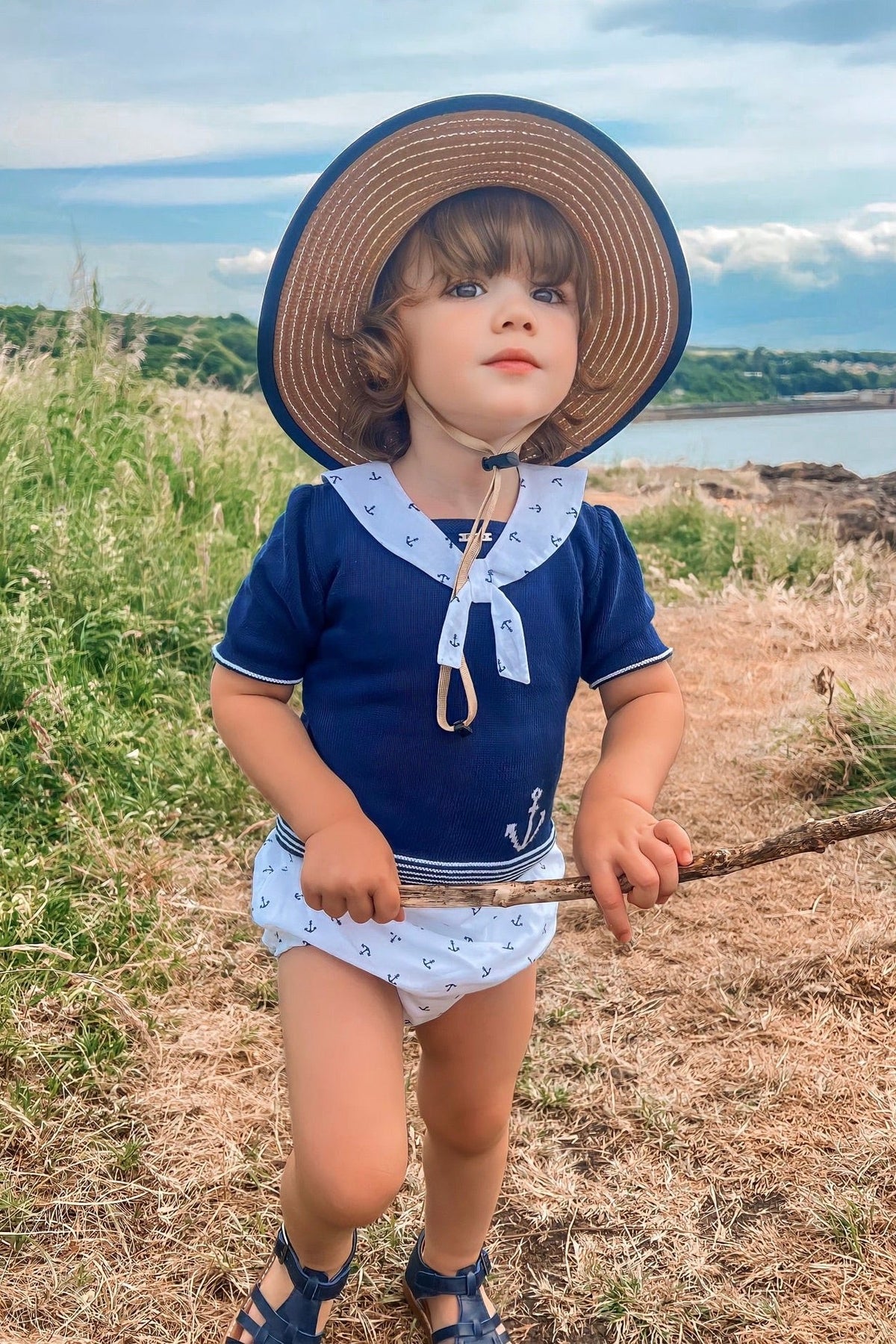 Baby boy's knit outfit set from Spanish brand Foque. Lightweight navy knit short sleeve top with white stripe trims, white anchor motif and navy anchor print sailor style collar, paired with matching navy anchor print jam pants.