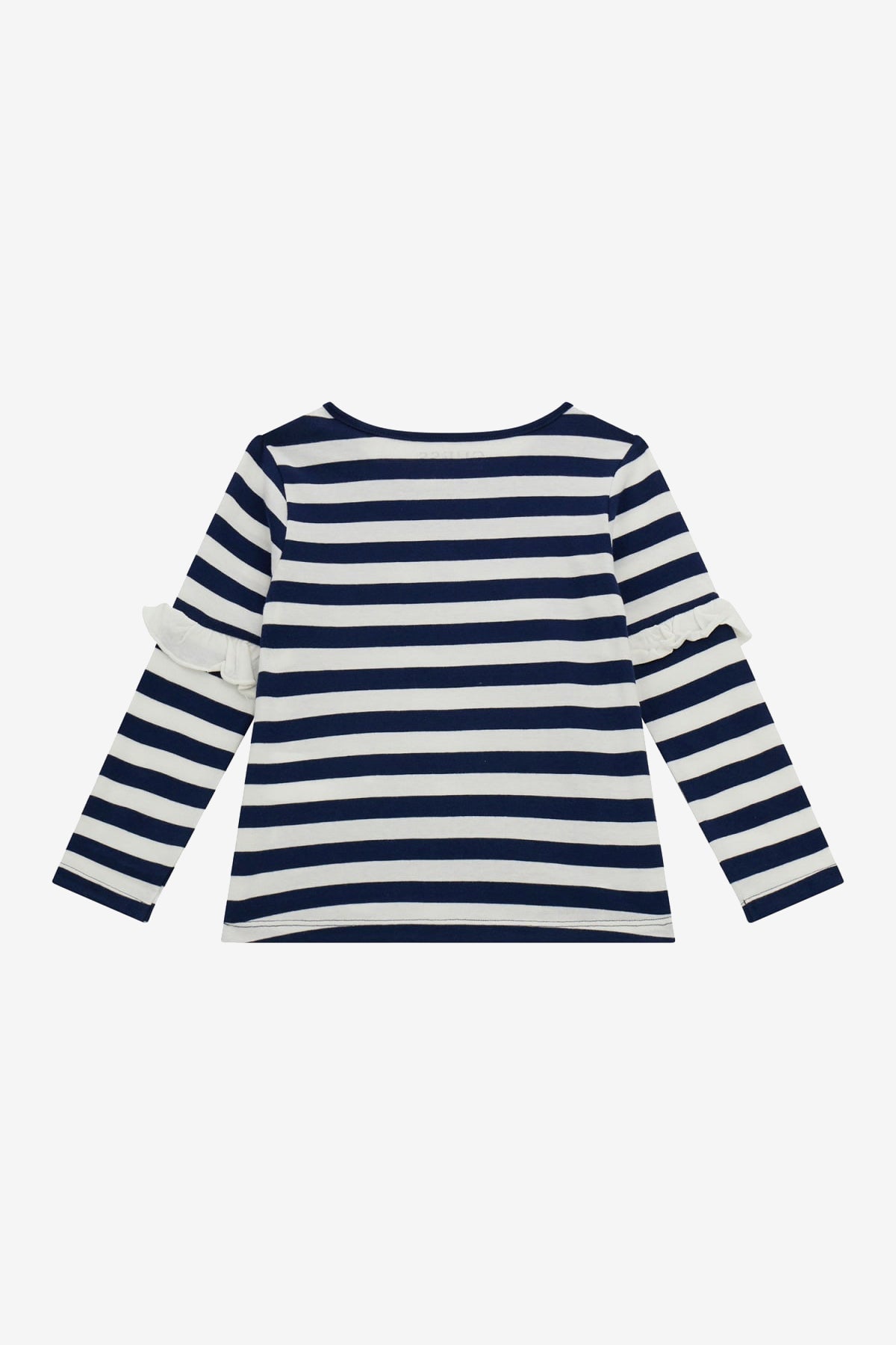 Every day feels magical in this adorable GUESS® Kids top. Made from soft, slightly stretchy jersey cotton, it’s designed in classic navy and white stripes with sweet frill details at the sleeves. The front sparkles with pink sequin lettering, gold glitter accents, and a floral heart appliqué that captures the joy of childhood. Perfect for pairing with jeans, leggings, or a skirt – a little sparkle for every adventure.