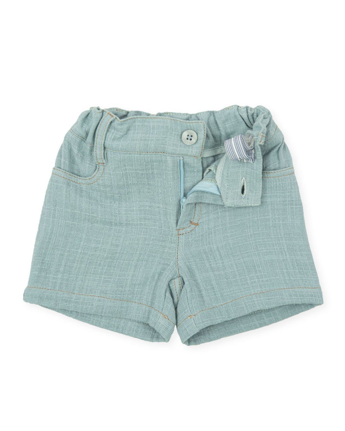 Button fastening to front of shirt and shorts. Shorts have adjustable waist.