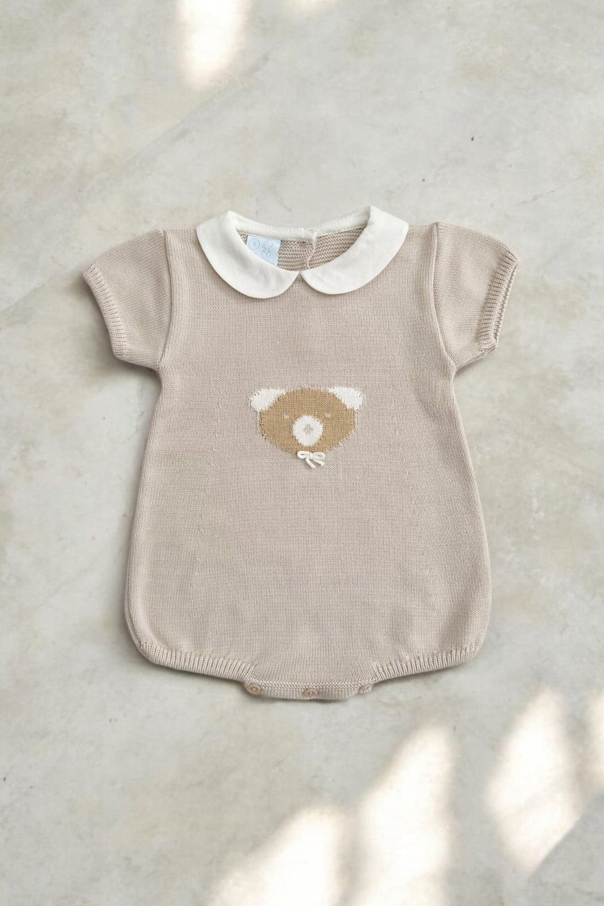 Add a touch of timeless charm to your baby boy’s wardrobe with this beautifully knitted romper from Granlei. In a soft stone hue, it features an adorable beige teddy bear motif at the chest, paired with an elegant ivory woven collar for a traditional twist. Made from a gentle, mid-weight knit that feels cosy yet breathable, it's perfect for sunny days and special outings alike. Back and crotch button fastenings make dressing effortless.