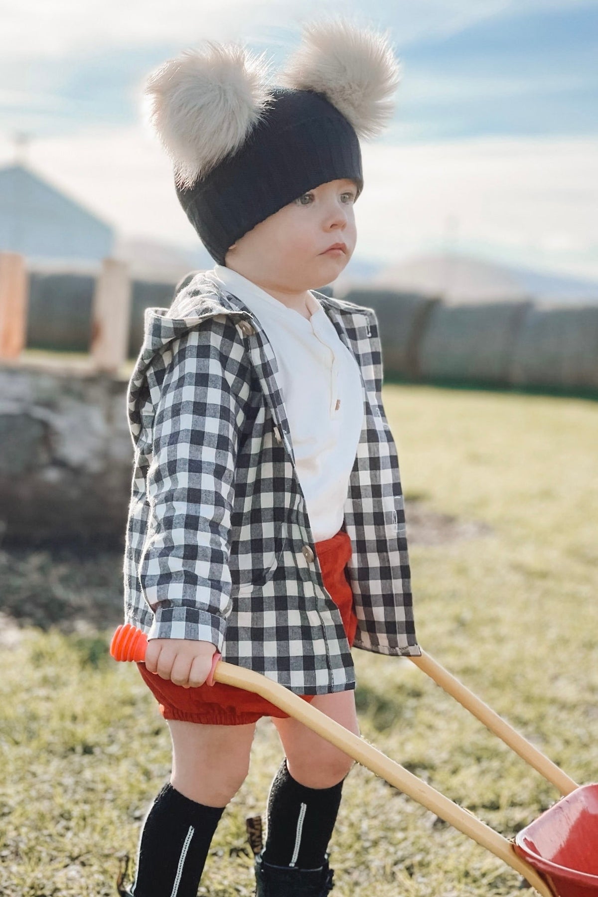 Baby boy's outfit set from Spanish brand Valentina Bebes. Ivory jersey cotton long sleeve top underneath black and white gingham woven cotton hooded jacket, paired with super soft rust-coloured needle cord shorts.