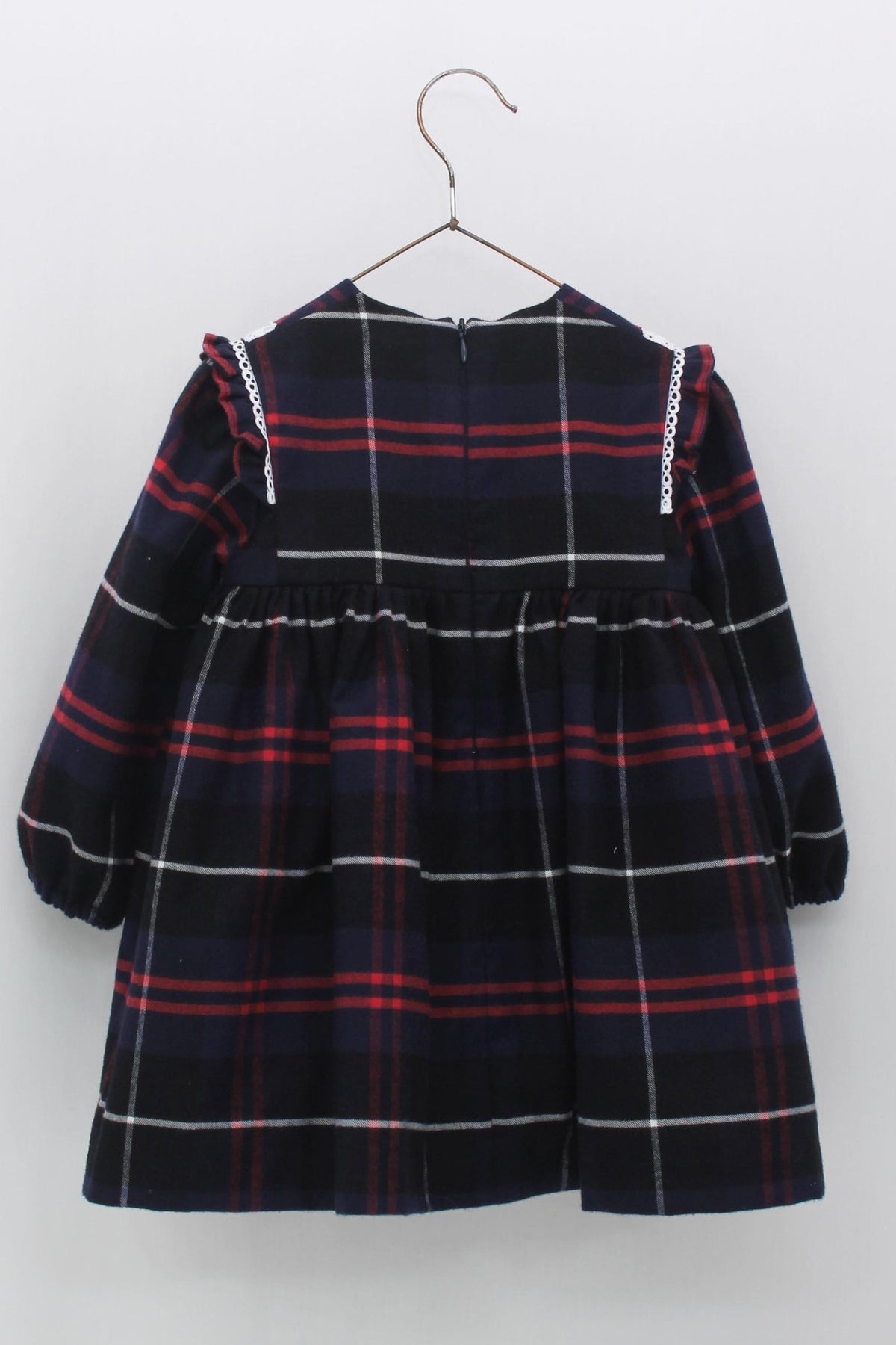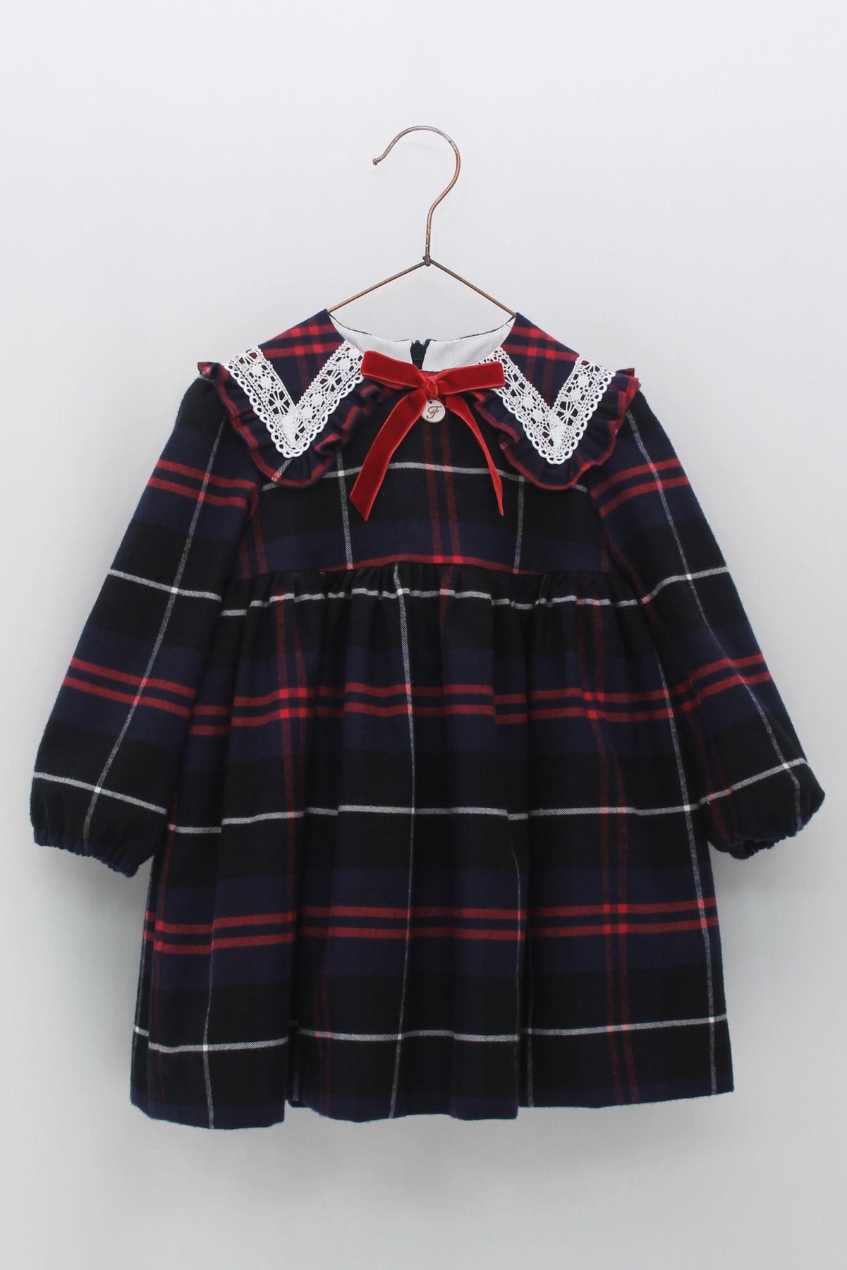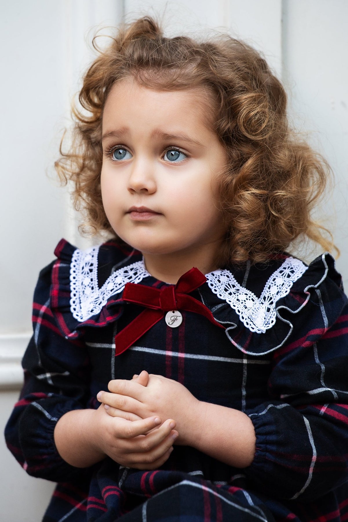 Girl's tartan dress from Spanish brand Foque. Navy and red tartan dress with stylish puritan-style collar decorated with white lace, finished with a large red velvet bow topped with a luxurious mother of pearl branded disc to the neck.