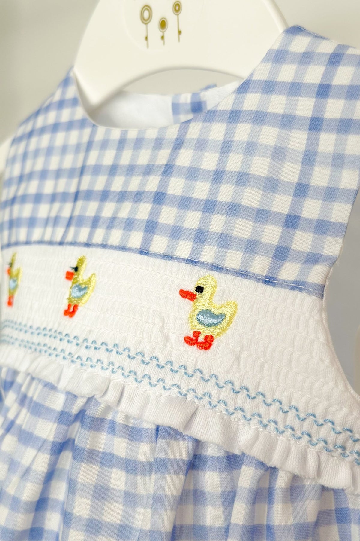 "Harrie" Blue Gingham Smocked Duck Romper