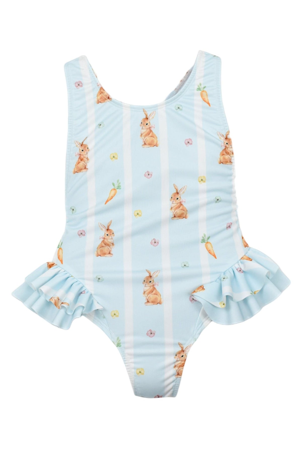 Sweet, playful and made for sunny adventures, the Bahamas swimsuit in the Bunnies print is a beautiful blend of comfort and charm. The soft blue striped base is dotted with adorable bunny illustrations, tiny florals and carrots – a whimsical design that feels timeless rather than novelty.