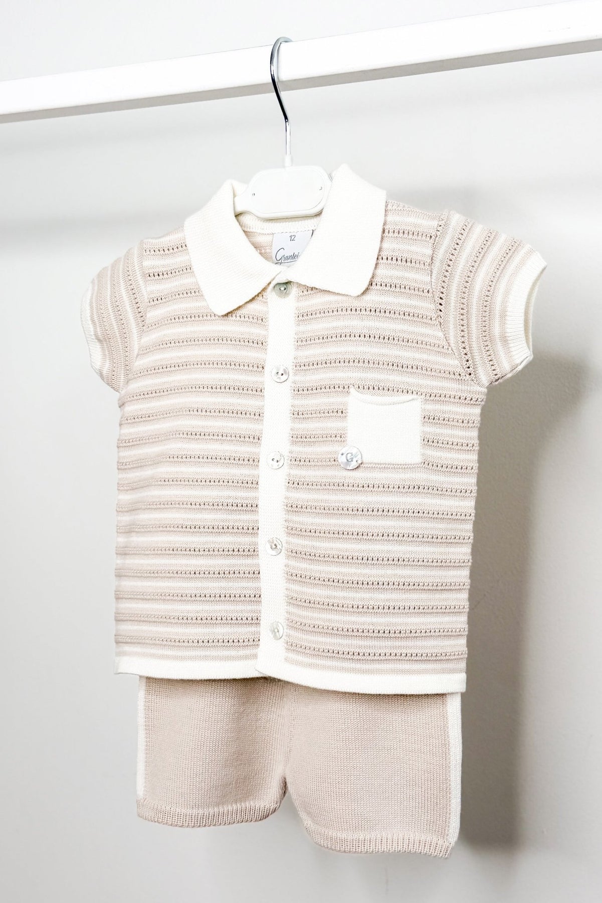 The coordinating knitted shorts complete the set, finished with an ivory side stripe and an adjustable elasticated waist to ensure a comfortable, flexible fit as they grow.