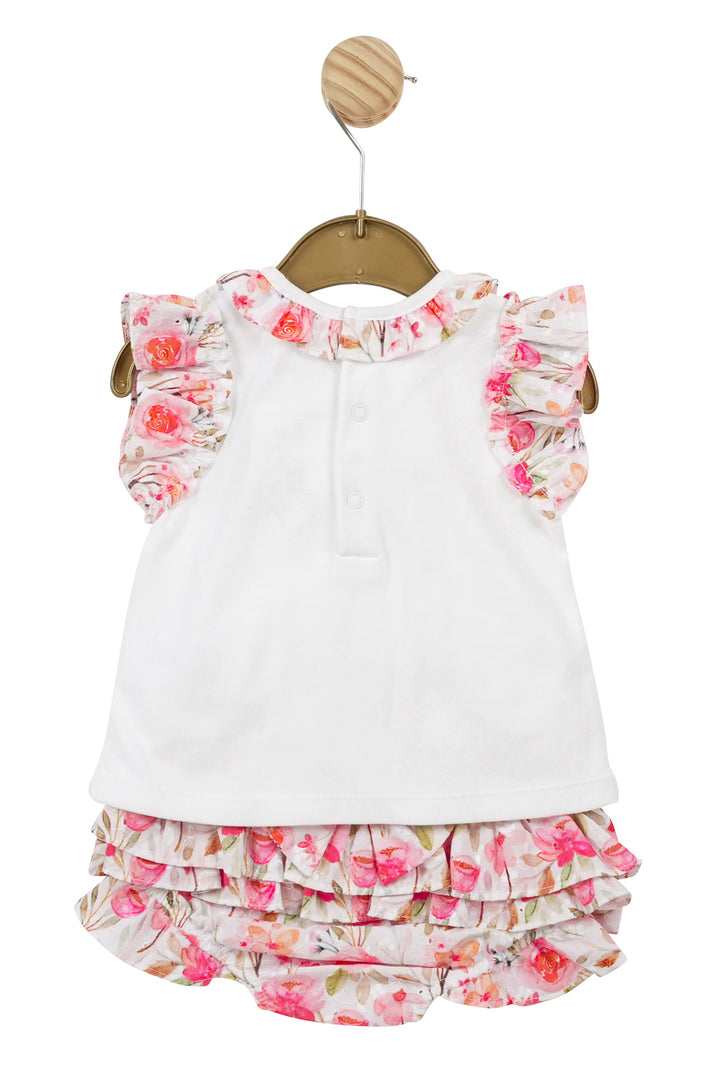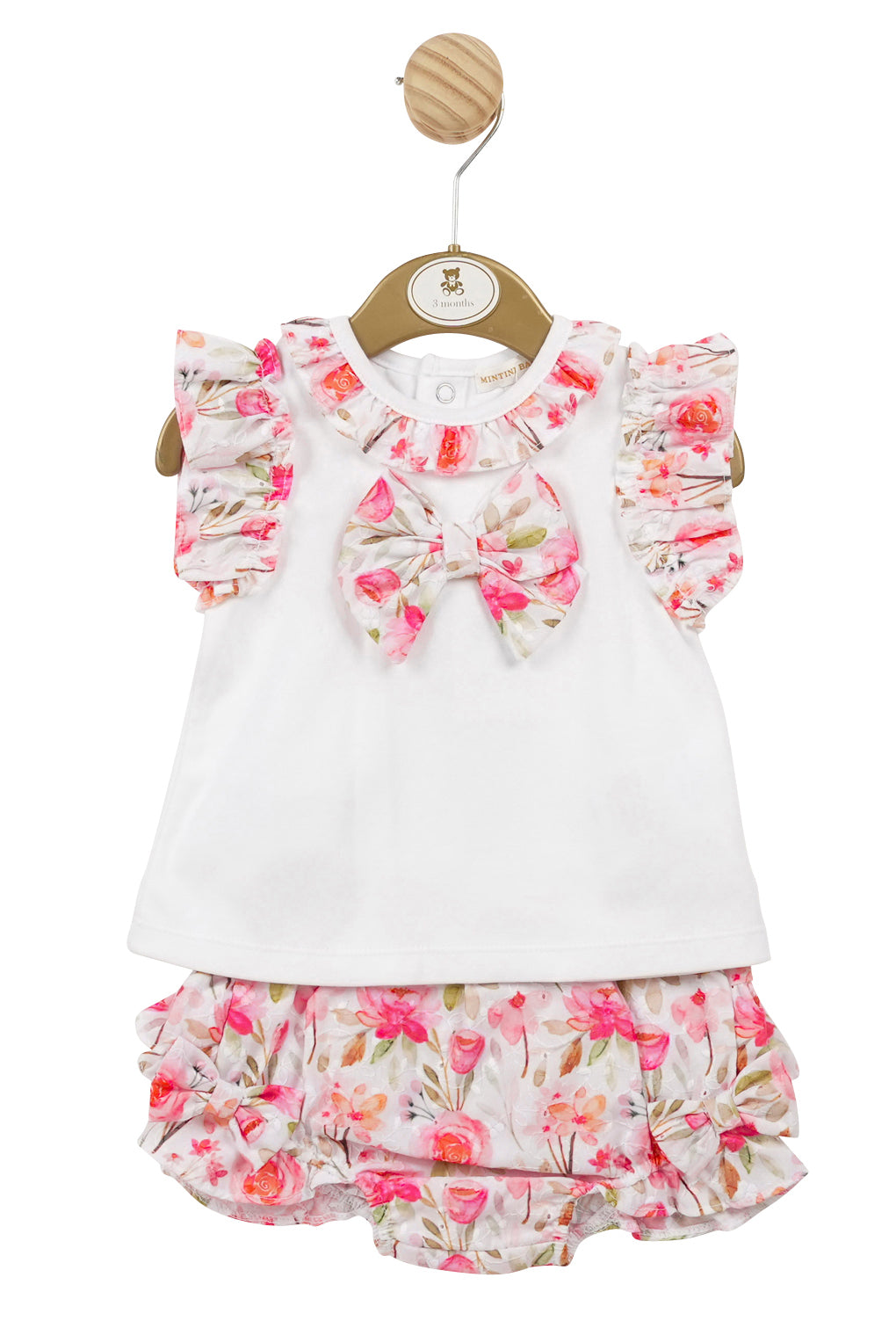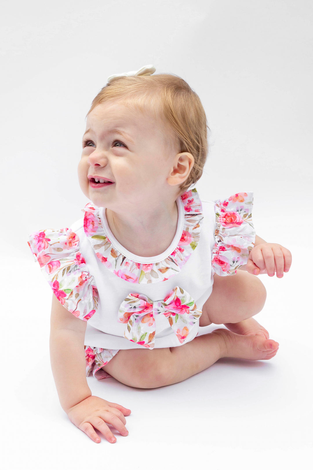 Baby girl's floral outfit set from British brand Mintini Baby's Spring/Summer '24 collection. Indulge in the luxurious softness of this white jersey cotton blouse adorned with girly hot pink floral print frills and a matching bow. The look is completed with lightweight cotton bloomers featuring a bold floral print and frills at the back, finished with a charming bow.