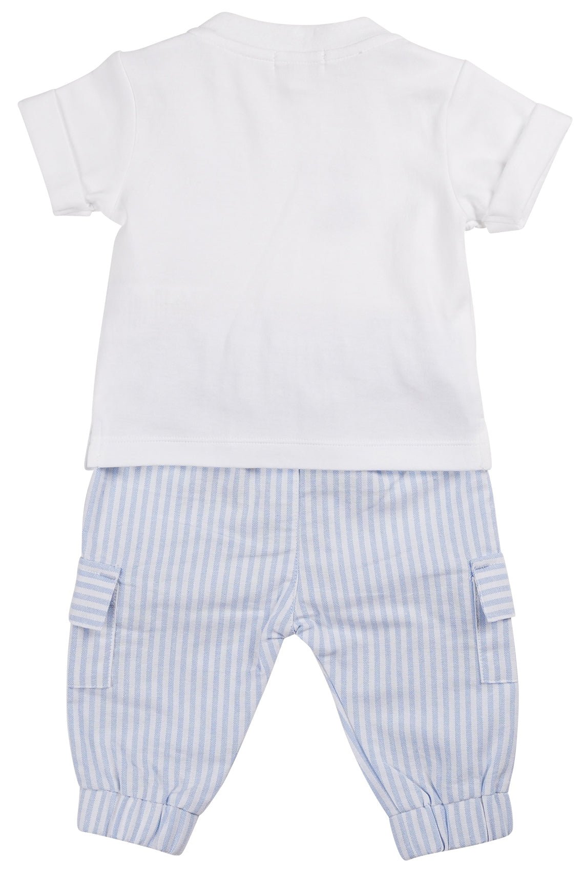 This Mintini baby boys' 2-piece set offers a stylish and practical outfit for little explorers. The soft white jersey cotton t-shirt features a blue terry towelling "M" emblem, paired with blue striped woven cotton cargo trousers for a smart yet casual look.