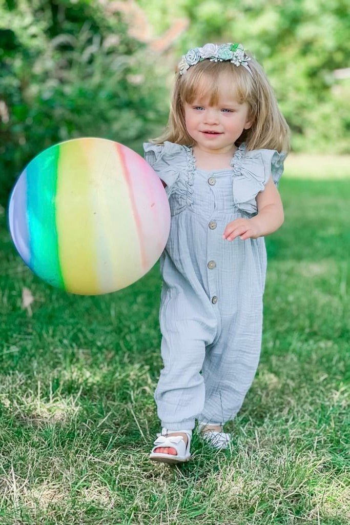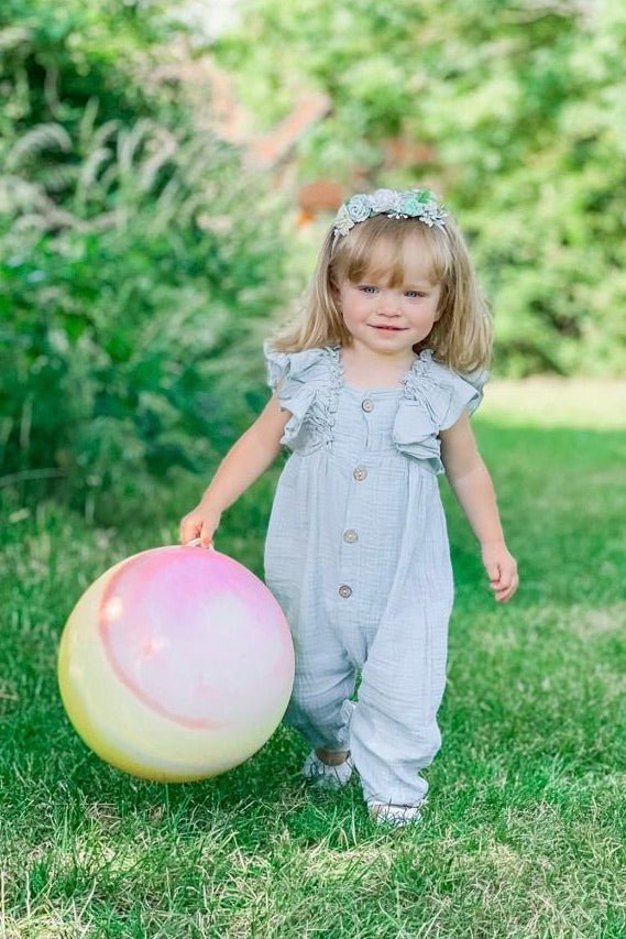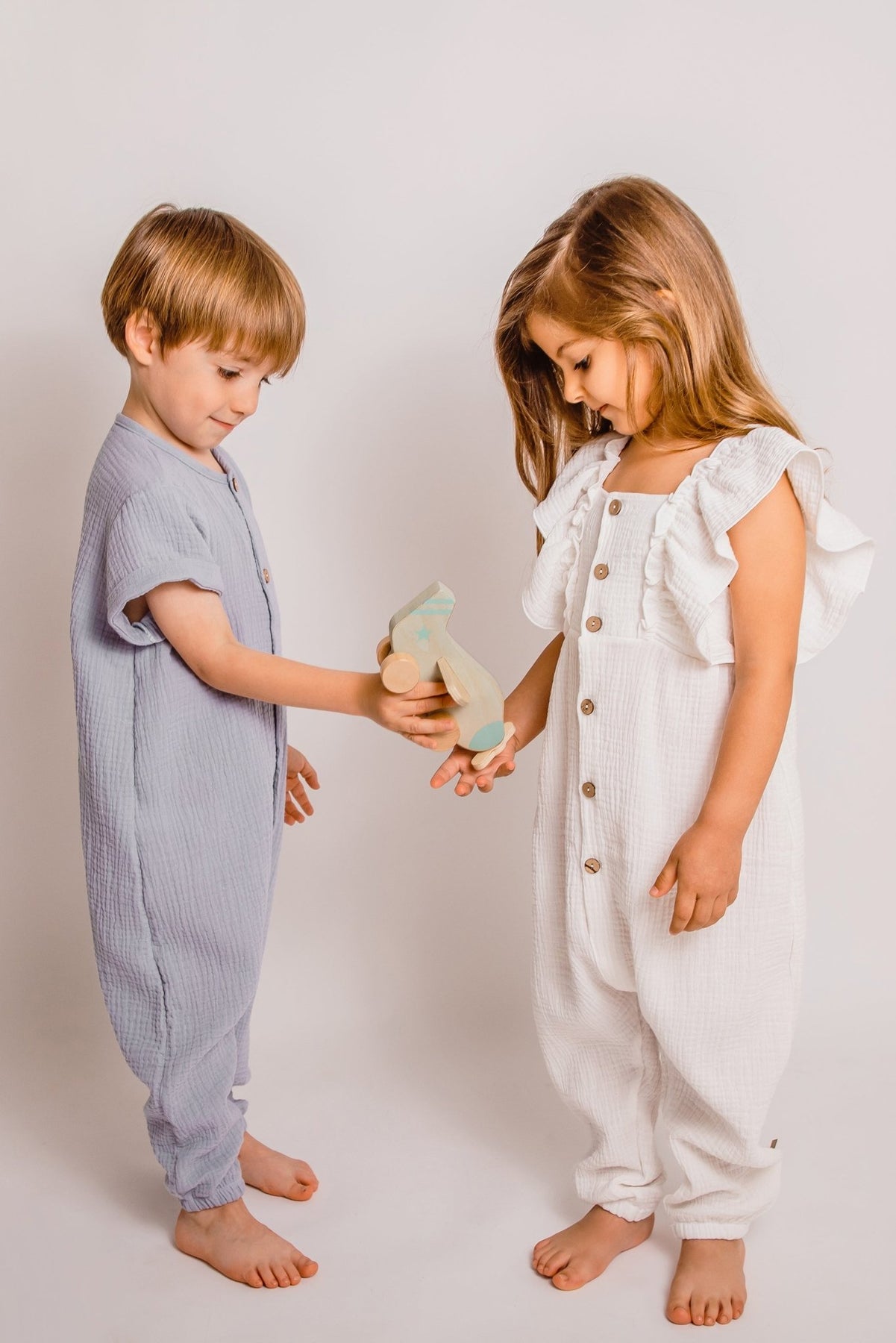 Girl's jumpsuit from Spanish brand Calamaro. Soft lightweight cheesecloth fabric jumpsuit with large ruffles to shoulders, with cork button fastening down the centre.