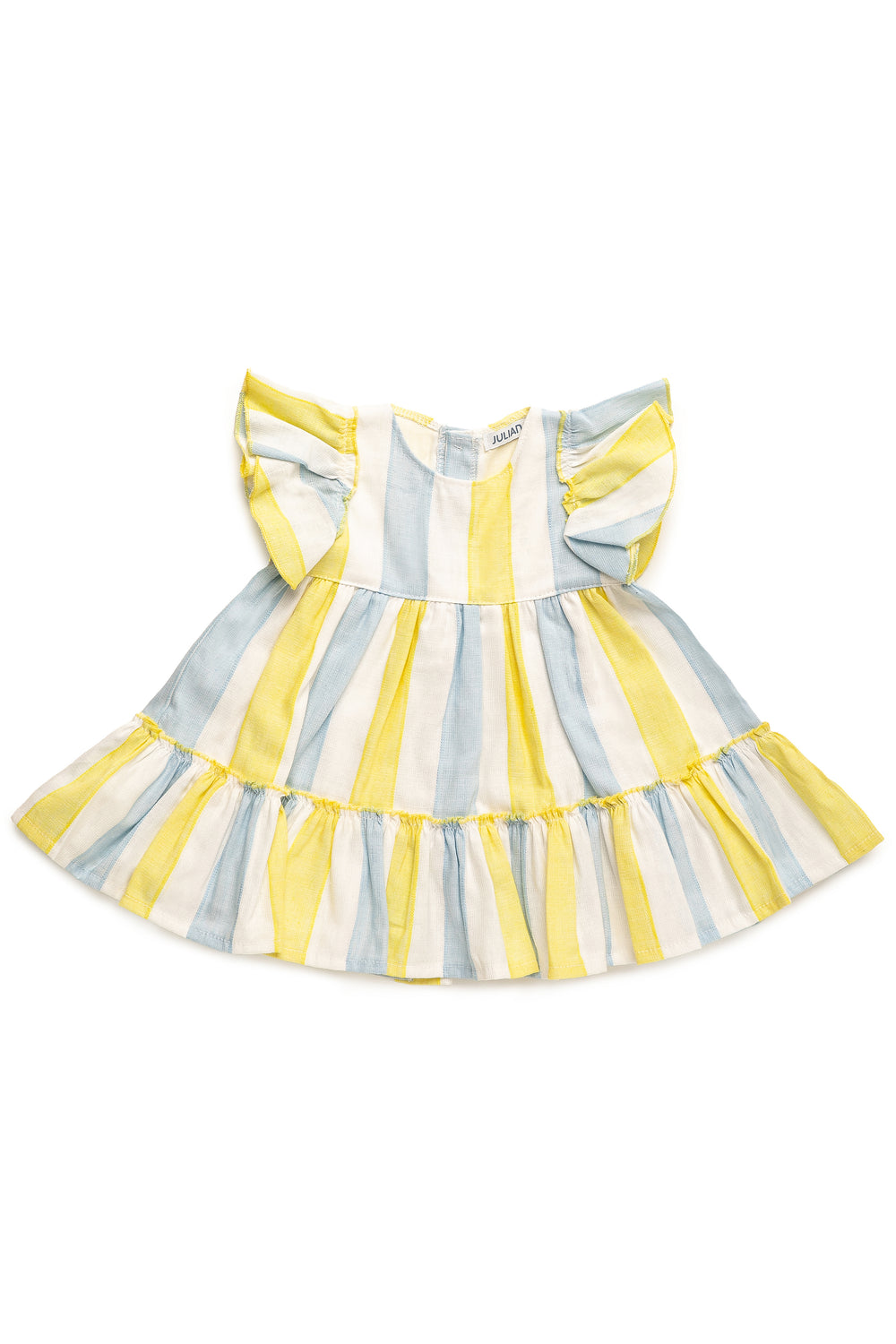 A breezy and elegant summer dress from Juliana, perfect for warm-weather adventures. Featuring soft yellow, blue, and white stripes, this lightweight woven cotton-linen blend ensures breathability and comfort. Delicate ruffled sleeves add a playful charm, while the flared tiered skirt gives it a graceful silhouette. Fully lined for a soft feel against the skin, this dress fastens with pearlised buttons down the back for easy dressing. A timeless and stylish choice for sunny days.
